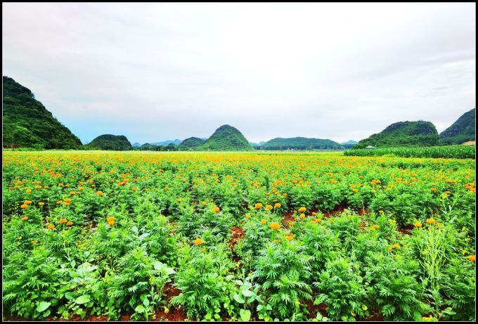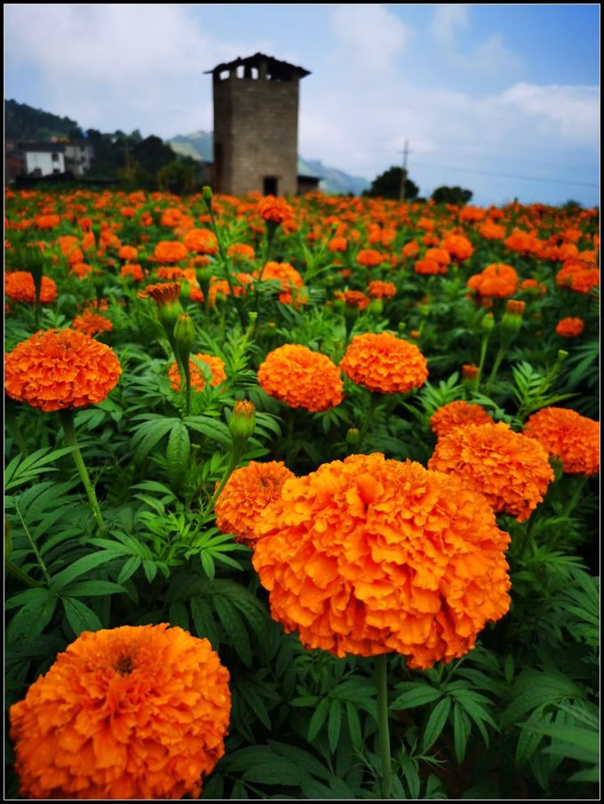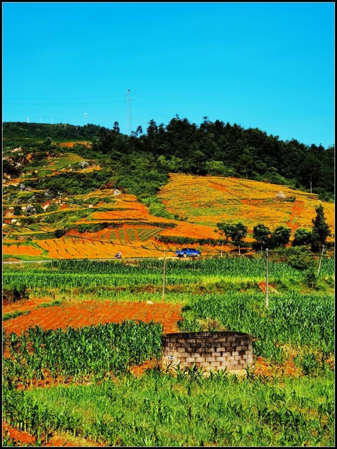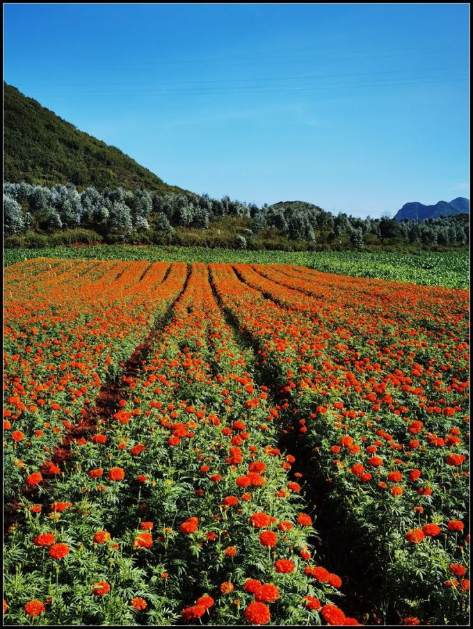 离开 普者黑 前往 红河 州的途中,漫山遍野盛开着栽种的万寿菊,金黄色的的万寿菊蔚为壮观。