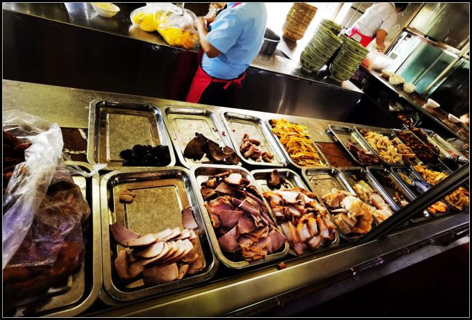 各种肉类有牛羊鸡和海鲜、有熟的、生的,有卤的、炸的、酱的,琳琅满目,可随意选择。