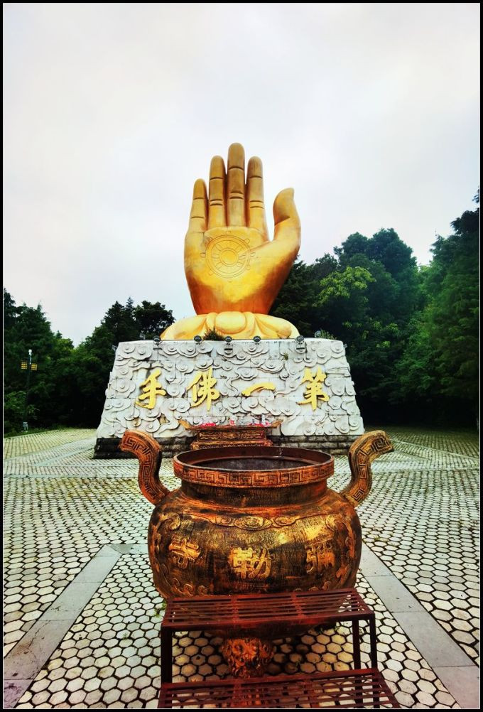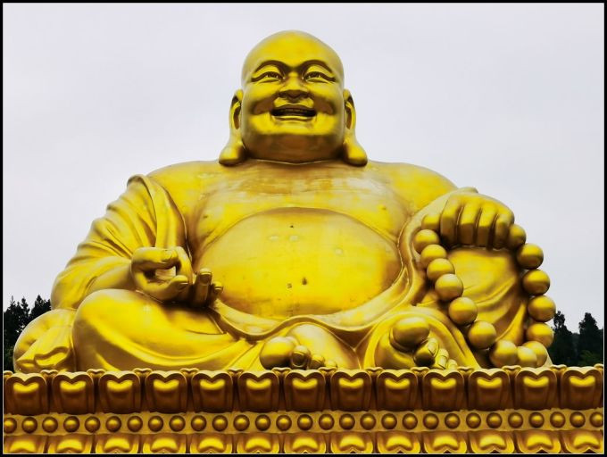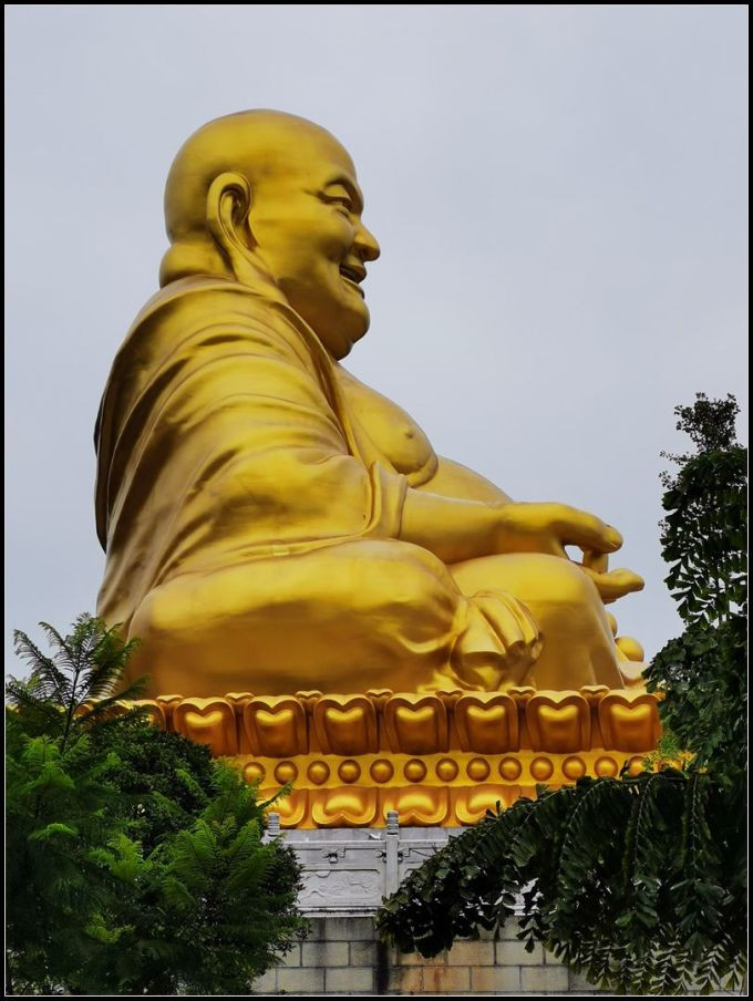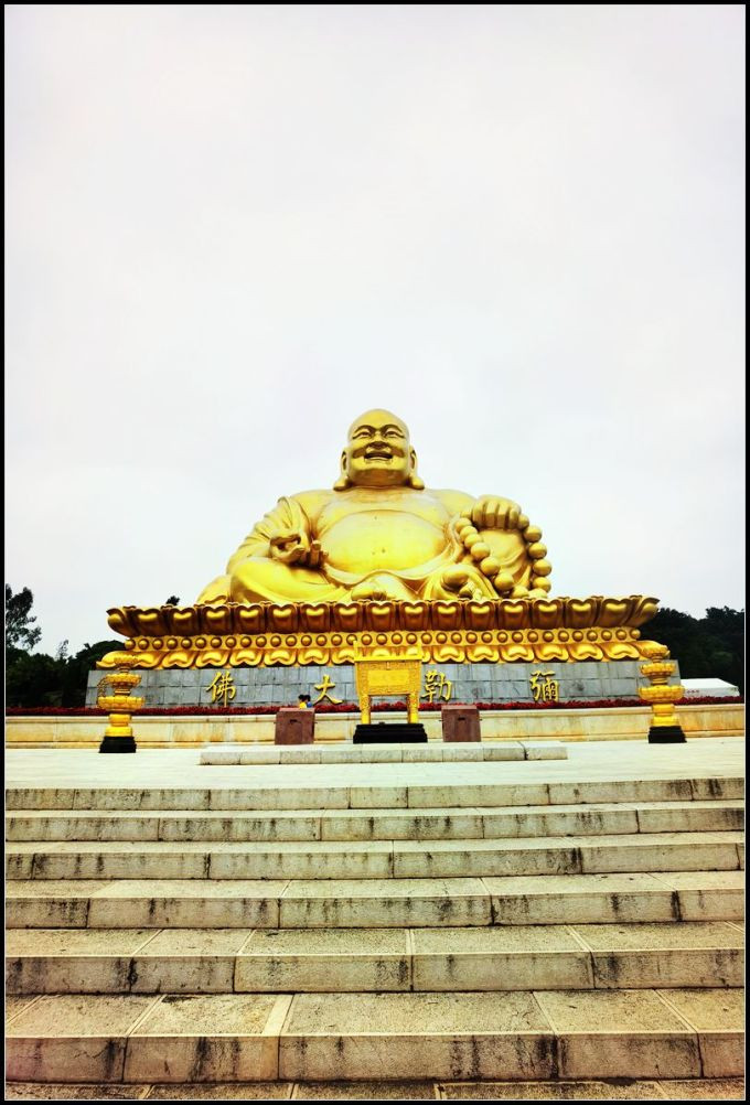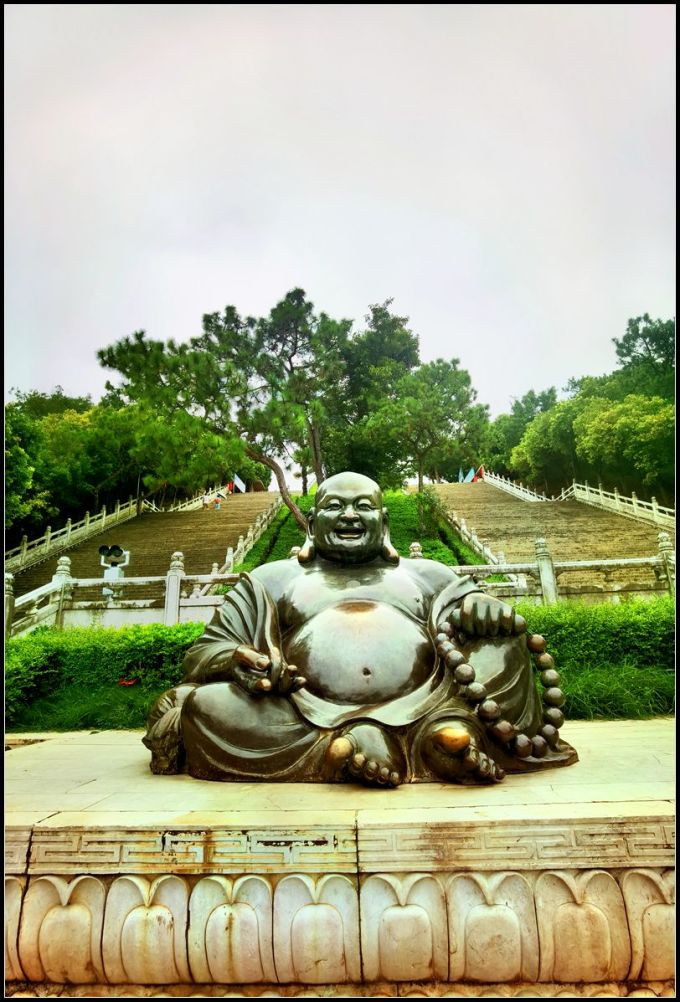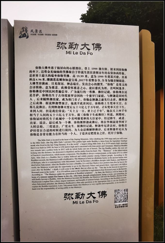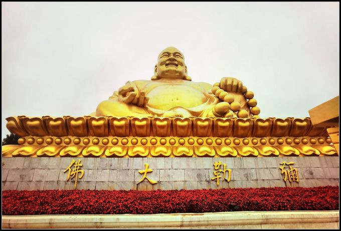 中国 佛教协会会长南怀谨先生亲笔题词的 弥勒 大佛( 弥勒布袋 相)于1999年12月落成,高度为1999厘米,是世界上最大的笑佛,象征跨世纪的祖国 和平 统一繁荣富强的美好祝愿。