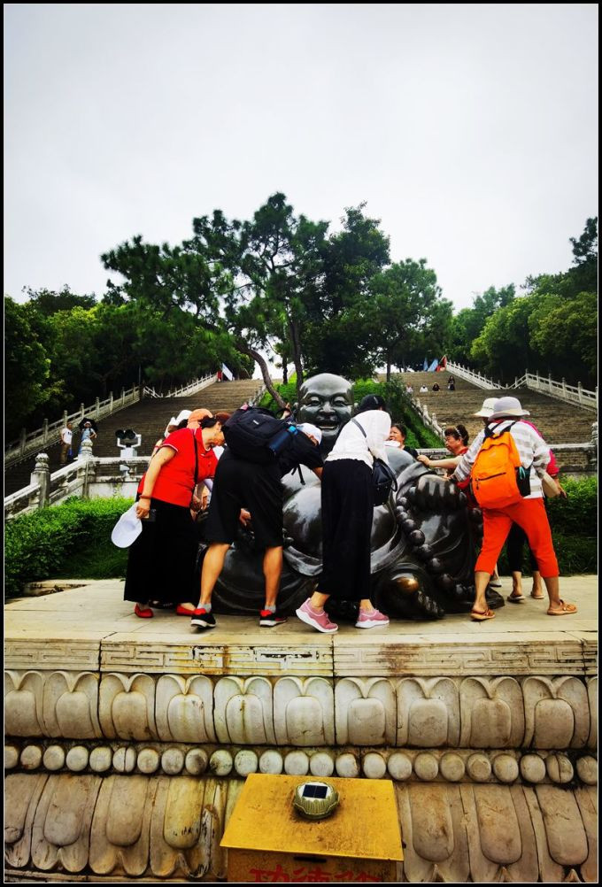 据说摸一摸 弥勒 笑佛可以带来好运,这些游客就围着 弥勒 转,不停地摸。