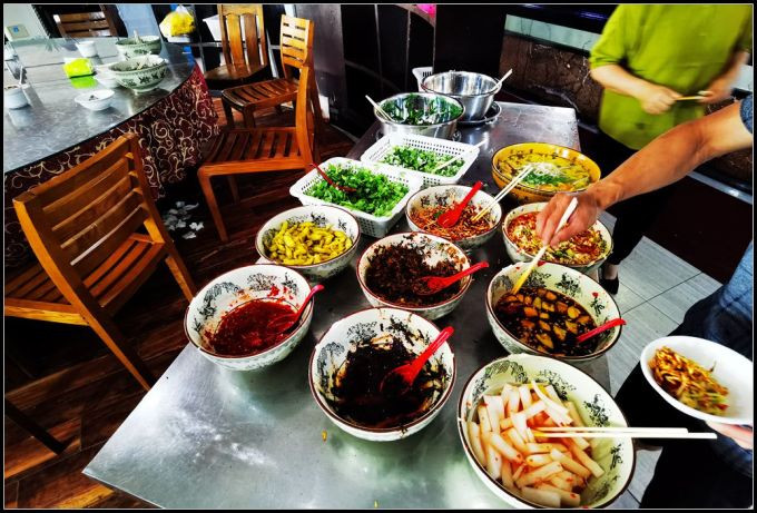 蒙自客人选好肉类以后,交于店里的大师傅负责把肉烫熟放入大海碗里,面线则由顾客自己在滚水桶里烫熟放入海碗。以前也吃过多次 云南 米线,但这次在 蒙自 才真正了解了 云南 米线正宗的吃法。