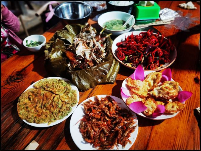 小龙虾、荷叶蒸鸡、荷花炒鸡蛋、炸荷花、野生小河虾