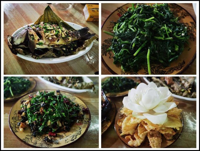 晚餐:荷叶蒸荷花鱼、炸荷花、韭菜炒田螺、炒野菜
