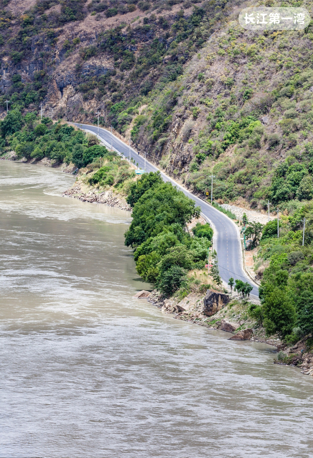 万里长江从“世界屋脊”——青藏高原奔腾而下, 巴塘 县城境内进入 云南 ,与 澜沧 江、 怒江 一起在横断山脉的高山深谷中穿行形成了“ 三江 并流”的壮丽景观。到了 香格里拉 县的沙松碧村,突然来了个100多度的急转弯,转向 东北 ,形成了罕见的"V"字形大弯,“江流到此成逆转,奔入中原壮大观”,人们称这天下奇观为“长江第一湾”。
