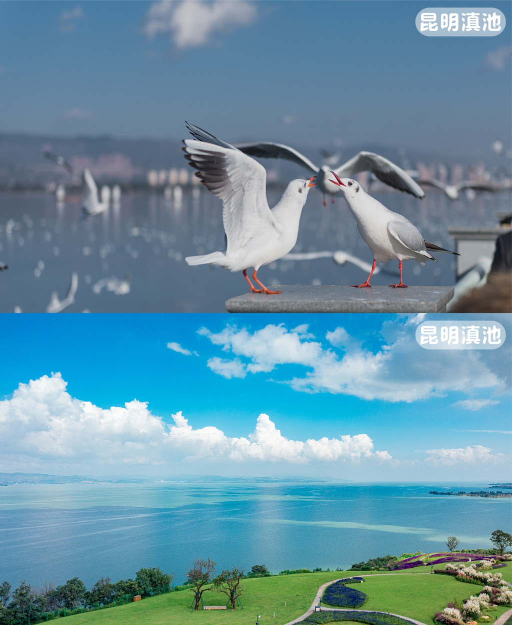 中国 第六大 淡水 湖,有着高原明珠之称的“滇池大坝”(每年的10月份到次年的4月份会有成千上万只从西伯利亚寒冷之地的红嘴鸥迁徙到 昆明 过冬,它们会一直盘旋在电池区域玩耍,直到冬季结束才返回自己的家园)