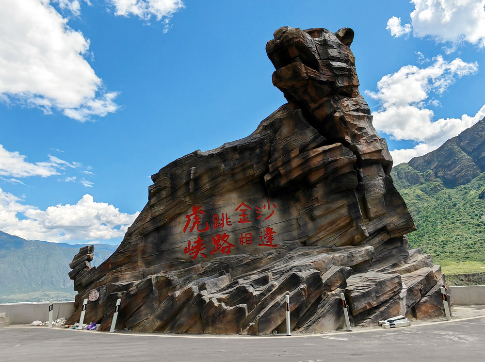 在下虎跳这里,最为引人注目的是在下虎跳隧道入口不远处的一座象形逼真的岩石虎型,上面刻着“虎跳金沙狭路相逢”八个红色大字历历在目。大家纷纷在此留影。