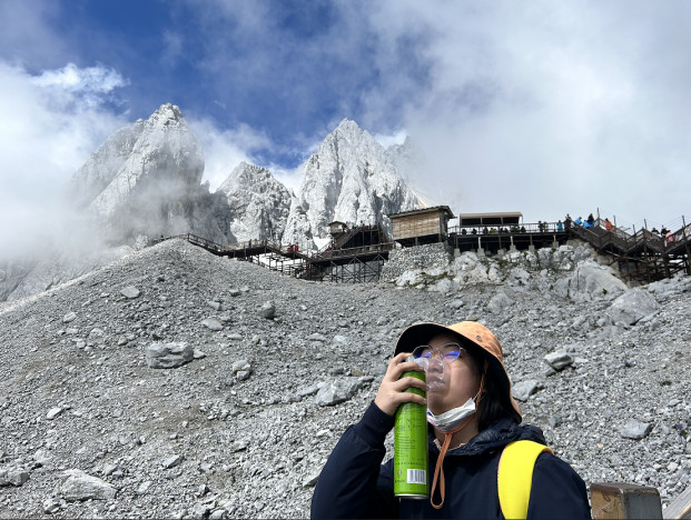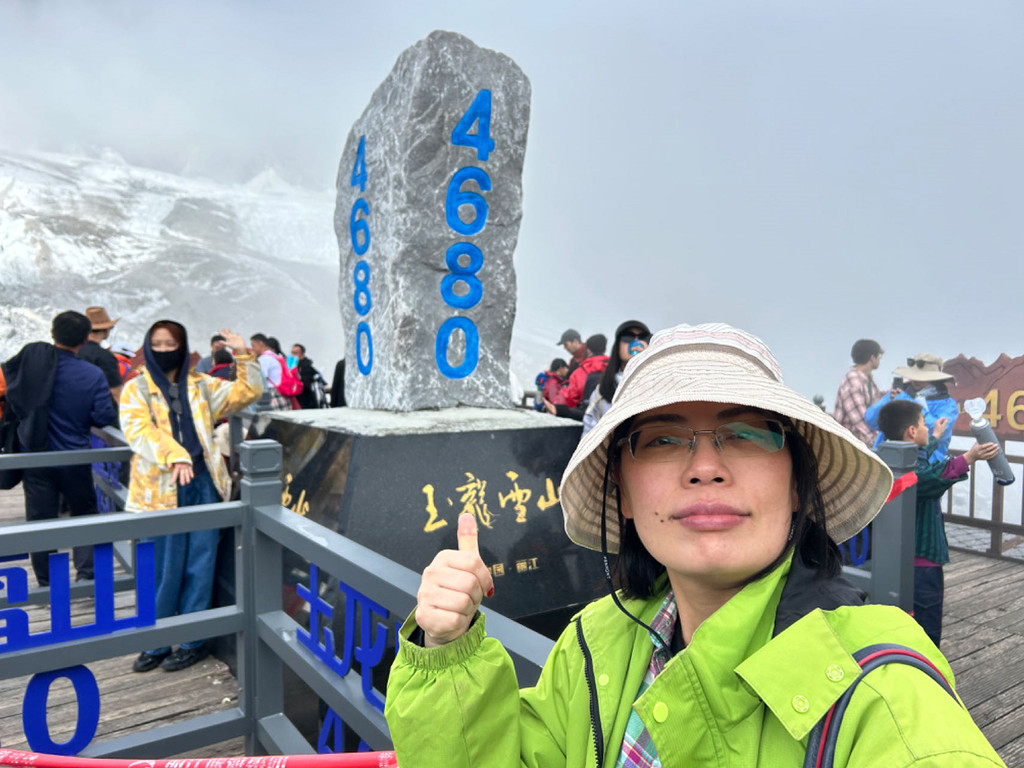 我们此次旅行最大的挑战,就是登上玉龙雪山。一人一件薄羽绒服和两瓶氧气,背包里是一些巧克力和牛肉干及水。当天云雾缭绕,偶有小雨。从一坐上索道车,我们就开始不间断的吸氧,做好高反的预防。下索道后,海拔已经是4500米,雾气腾腾,宛如仙境,气温极低。沿着木栈道,三步一休息,五步一吸氧,不时补充巧克力和牛肉干等高热量的食物。沿途不断有人由于高反严重,放弃继续攀登。尽管我们都有明显的高反感觉,特别是身体缺氧导致心肌加速运动,真的是“心疼”!但我们终于到达4680米的冰川公园,这是我们迄今为止,脚踏实地的最高海拔!无限风光在险峰!“仙人抚我顶,结发受长生”