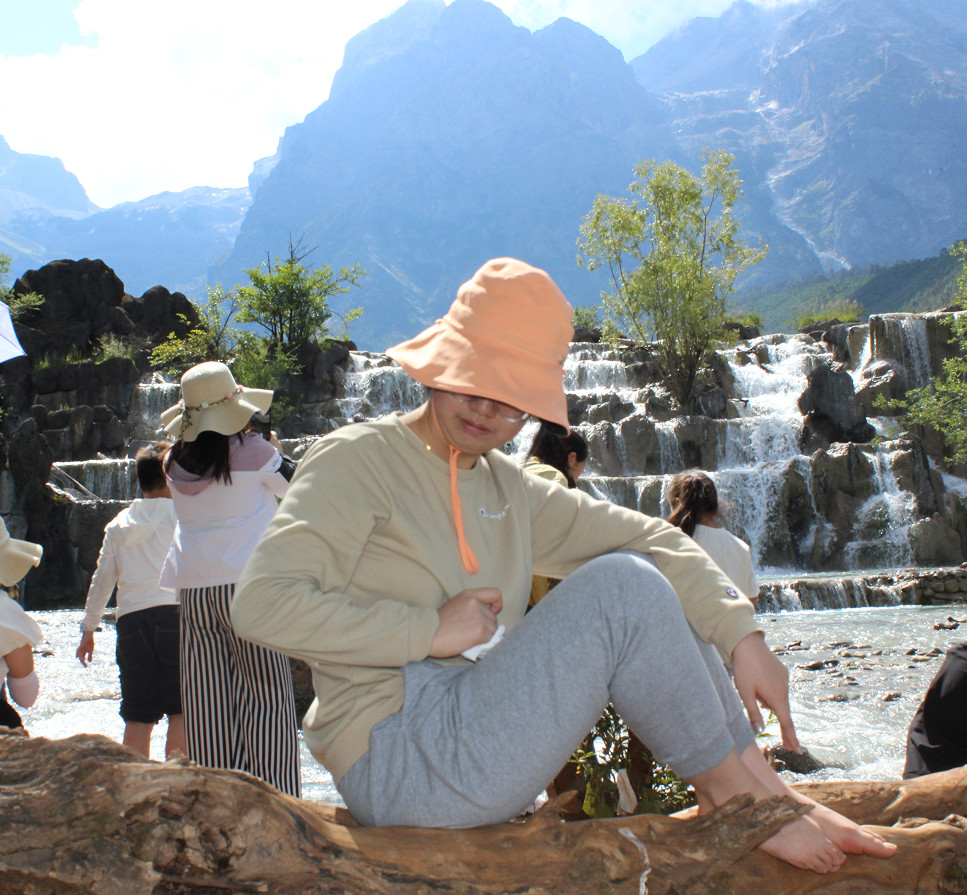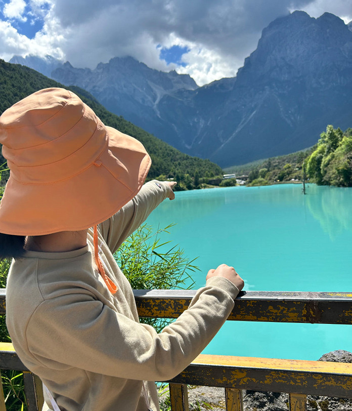 那段时间刚好是丽江的雨季,连续十多天的雨水,听说蓝月谷的水都是浑浊的。但我们是幸运的,来到蓝月谷后,阳光普照,大大小小的海子如同蓝宝石般,镶嵌在山谷之中。小朋友对于如此纯净的流水,天然是没有抵抗力的,立刻赤脚下水嬉戏,但随后马上又跑回岸上。因为这是冰川融水,水温极低,双脚冷的刺痛(坐在卧倒的枯树上的唯美的照片,实际上是在晾干小脚丫)。旁边多对情侣在拍结婚照,让神奇的大自然见证美好幸福的瞬间!