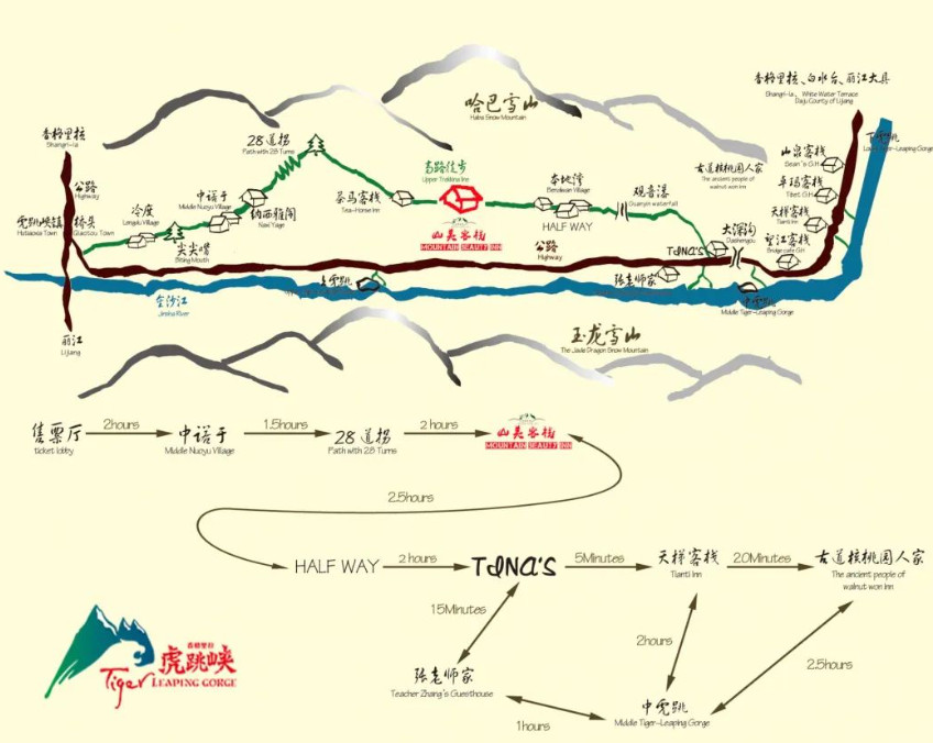 如果体力好且有时间的话,也可以选择高路徙步。到虎跳峡徒步可以选择不同线路。高路徒步一般耗时两天。中虎跳耗时一天,下虎跳半天。一路上,你会欣赏到不同景观——羊肠小道、山野丛林、悬崖绝壁,,巨浪滔天、瀑布飞流、险峻峡谷。标牌上随处可见中、英、韩三种文字,渲染着这条国际经典徒步线路的魅力。雨季徙步有一定的风险,注意防寒、防滑及落石。