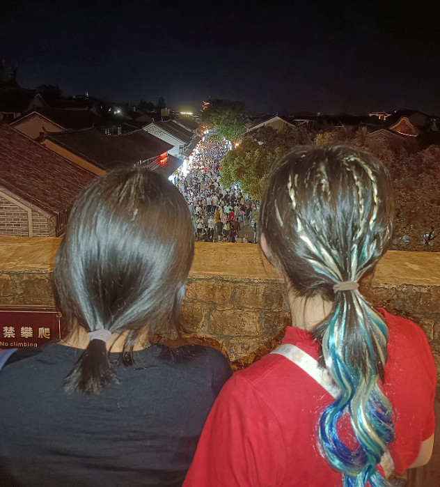 由于暑假旅游旺季,夜晚的丽江古城是人山人海,仿佛回到了大唐不夜城。我们三个都不喜欢太闹腾的地方,就回到狮子山上的客栈,远眺着世间的那份繁华!