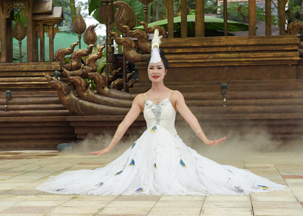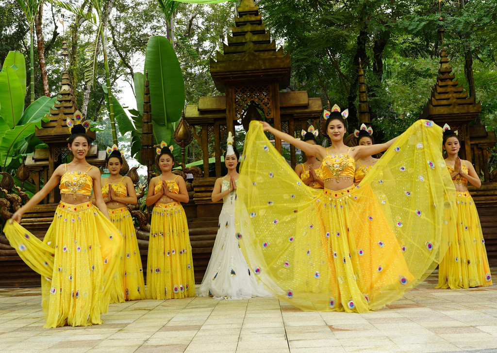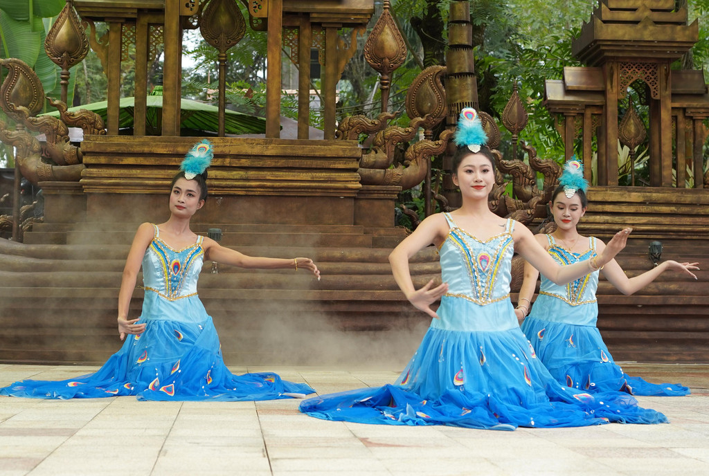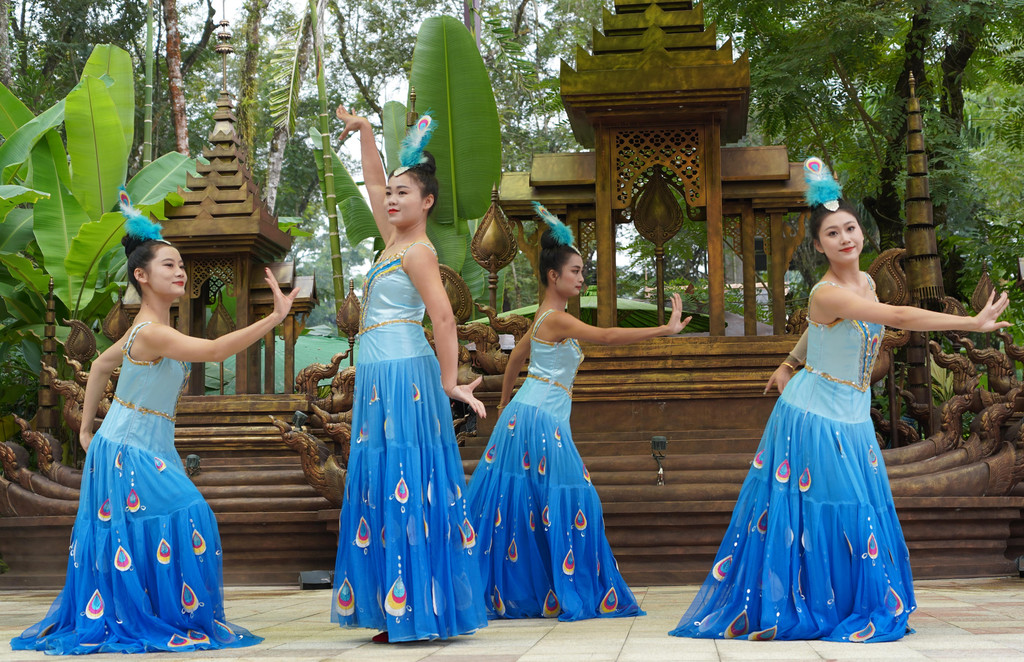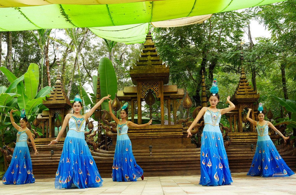 傣族园的孔雀舞值得观赏,哨多哩们随着音乐翩翩起舞;