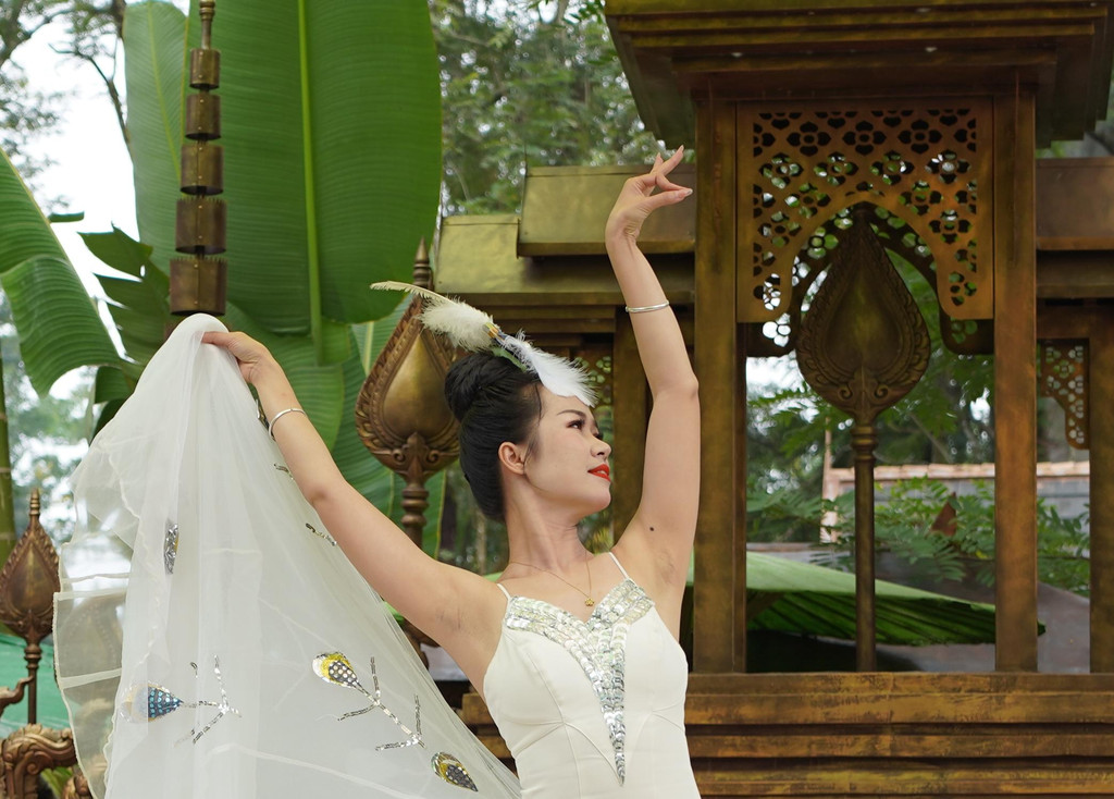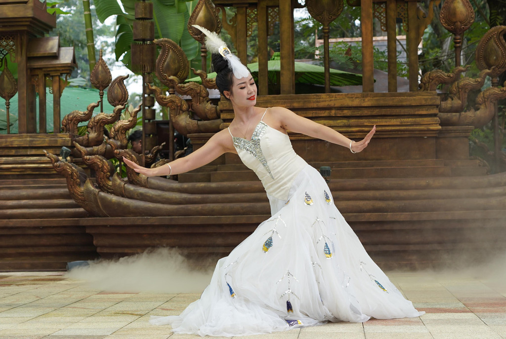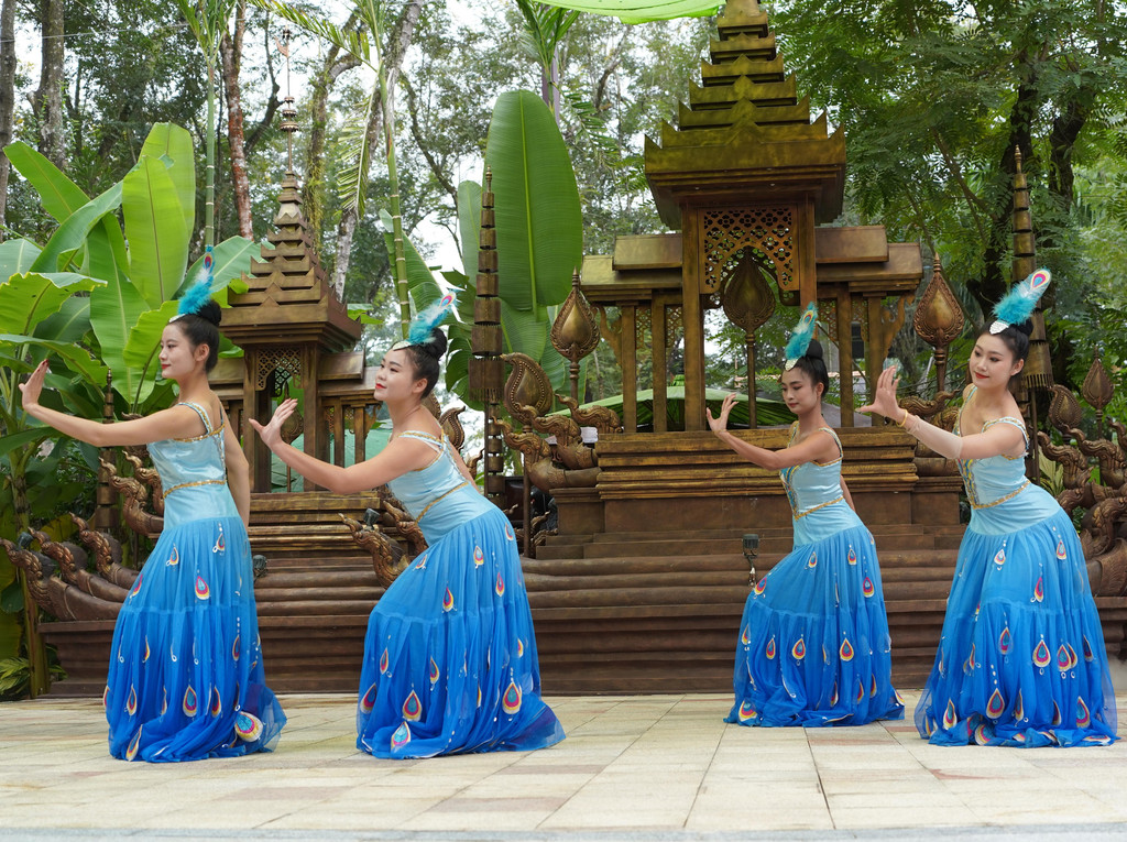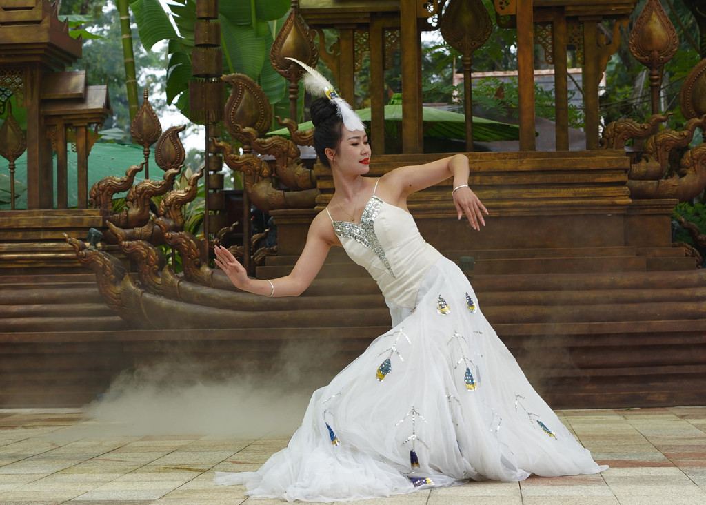 傣族园的孔雀舞值得观赏,哨多哩们随着音乐翩翩起舞;