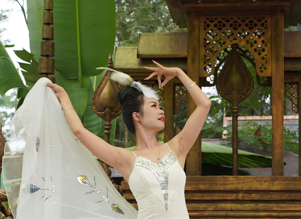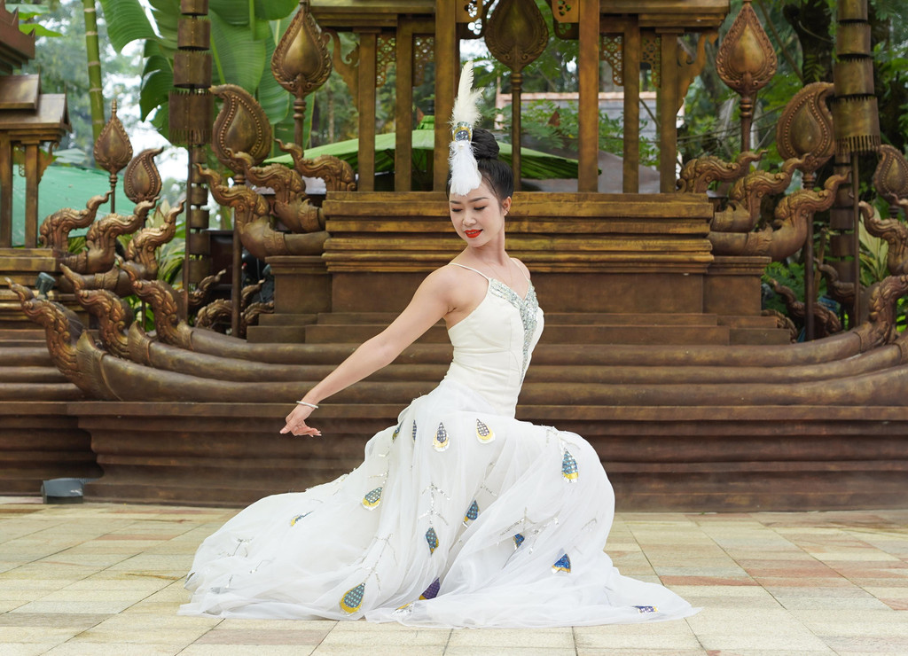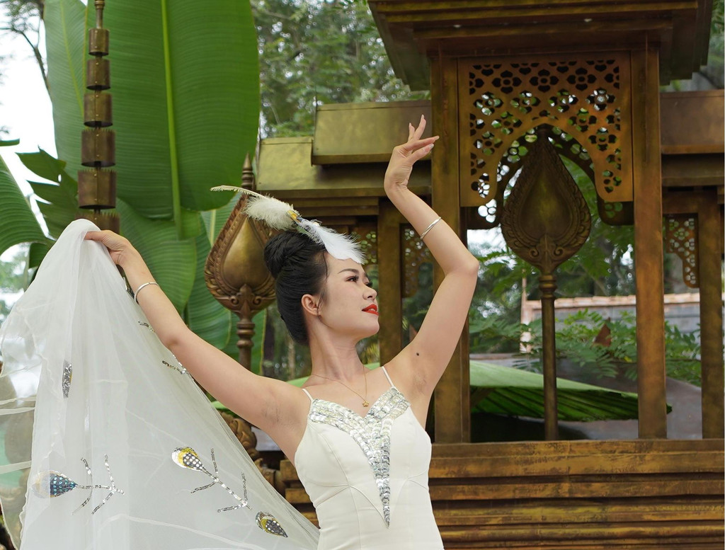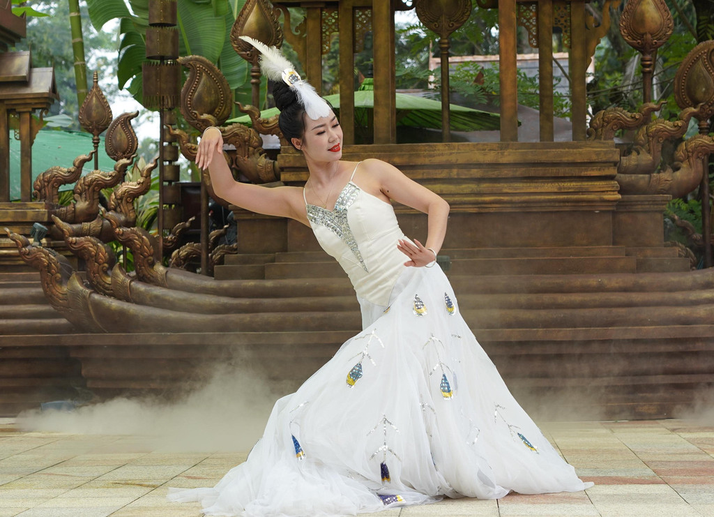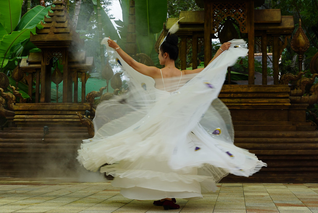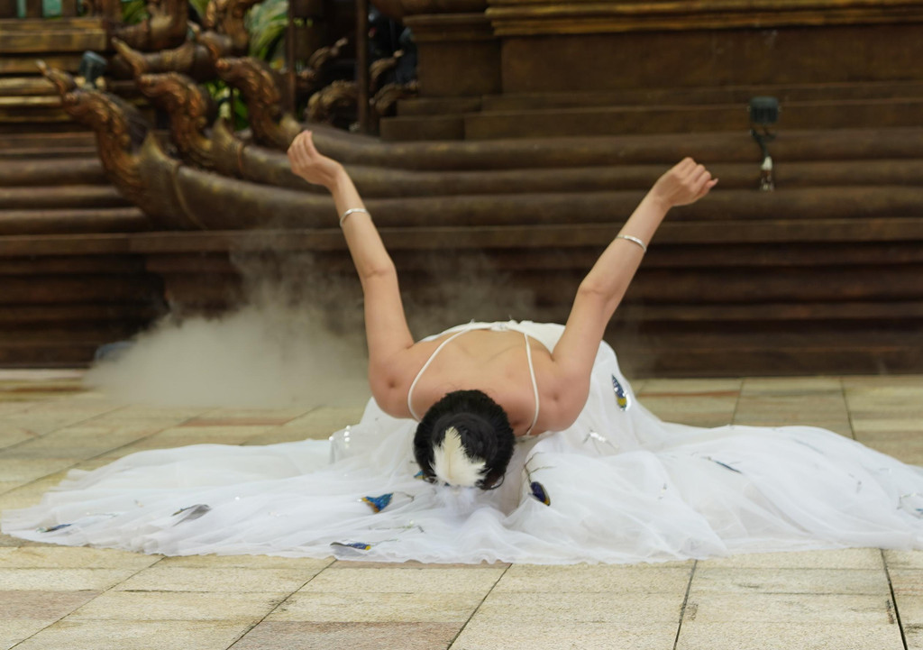 一位白衣演员把孔雀的形态表演的惟妙惟肖。