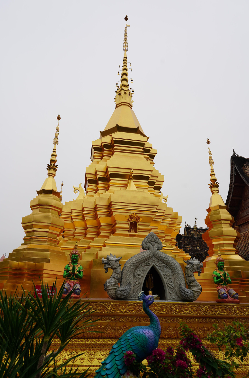 曼春满佛寺西北侧曼春满金塔由一大四小五座佛塔组成,共立于一个正方形基座上,主塔通高约12米。
