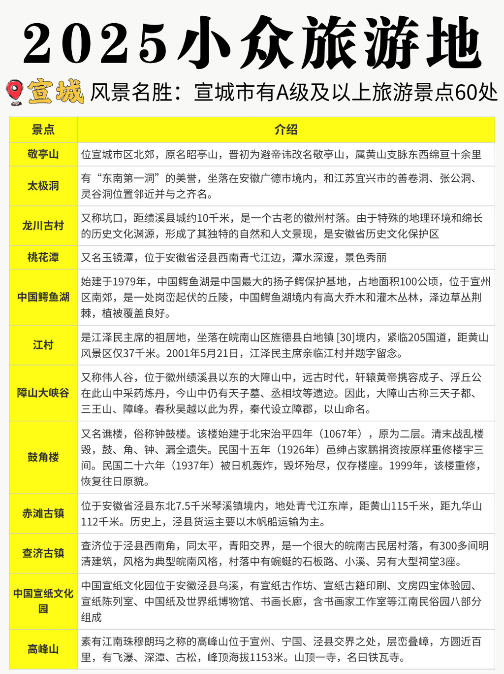 ①宣城:有A级及以上旅游景点60处