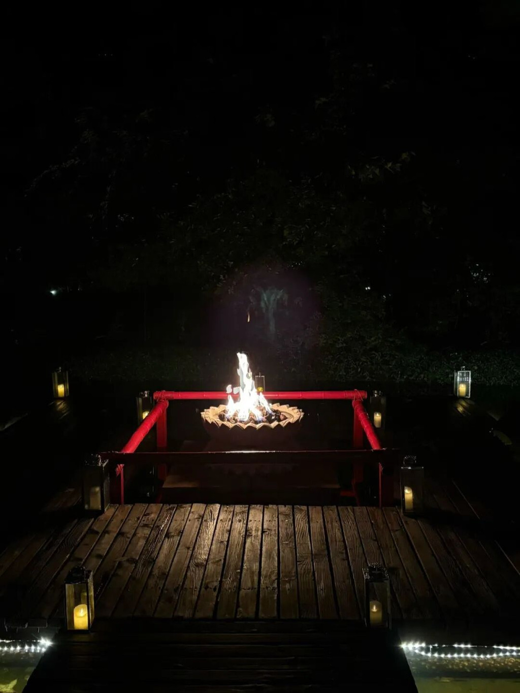 当天的侍酒师是2025杭州米其林指南侍酒师奖获得者Sam(汪昊)。暴雨中,解香楼门口的火焰不熄。