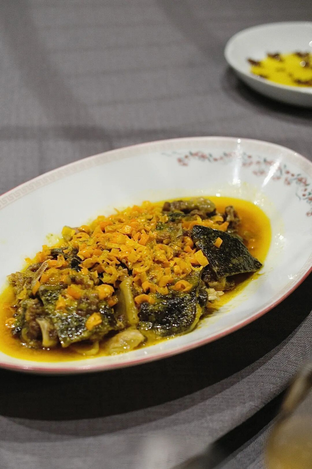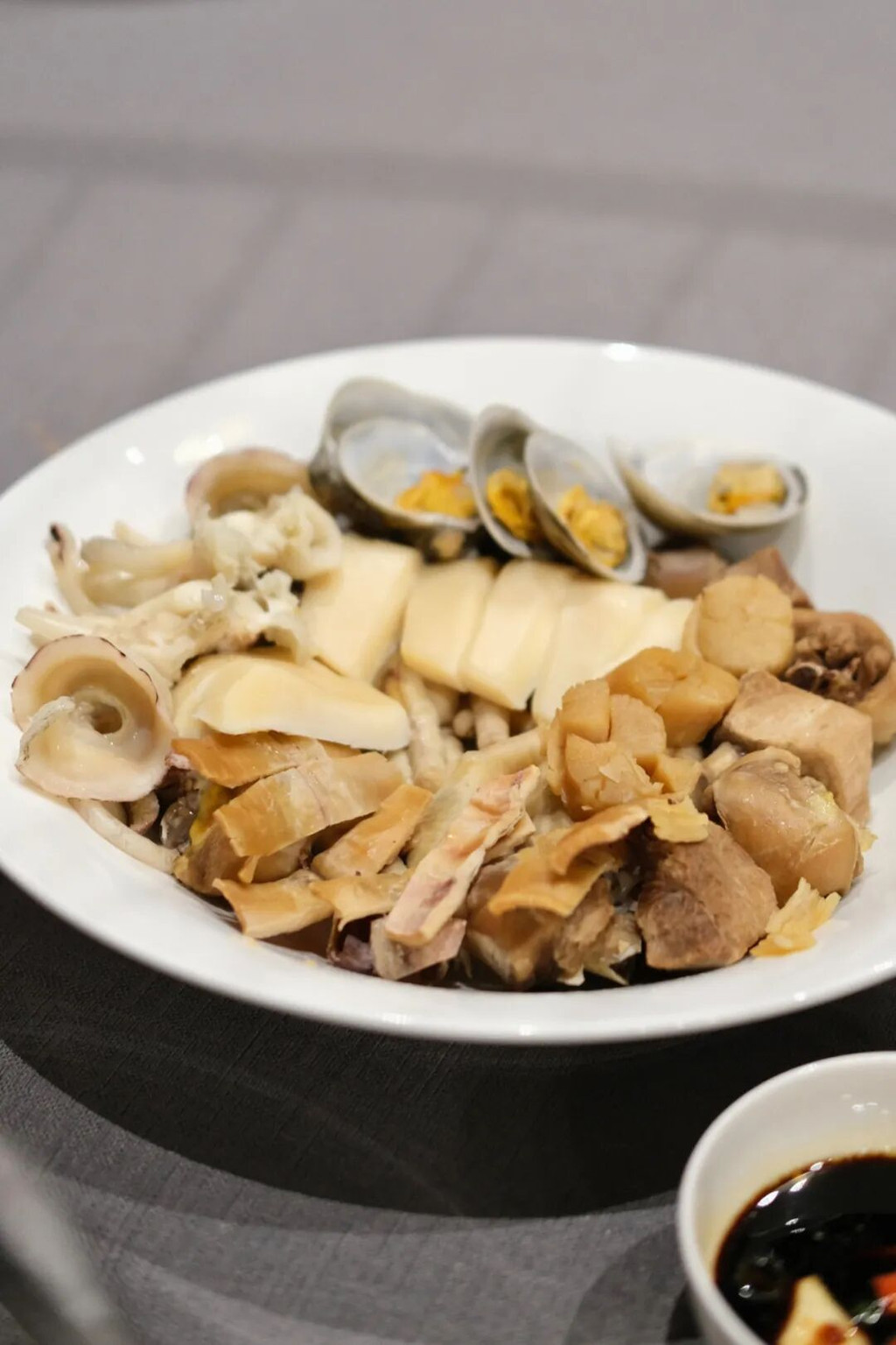 开渔季,解香楼准备好鲜目鱼与干目鱼,加一些蛤蜊、瑶柱,与土猪土鸡,煲了一锅清汤。水煮后的食材也单独拿出来了,蘸酱汁,并没有别的杂味打扰,我觉得很配当天吉宫的红。