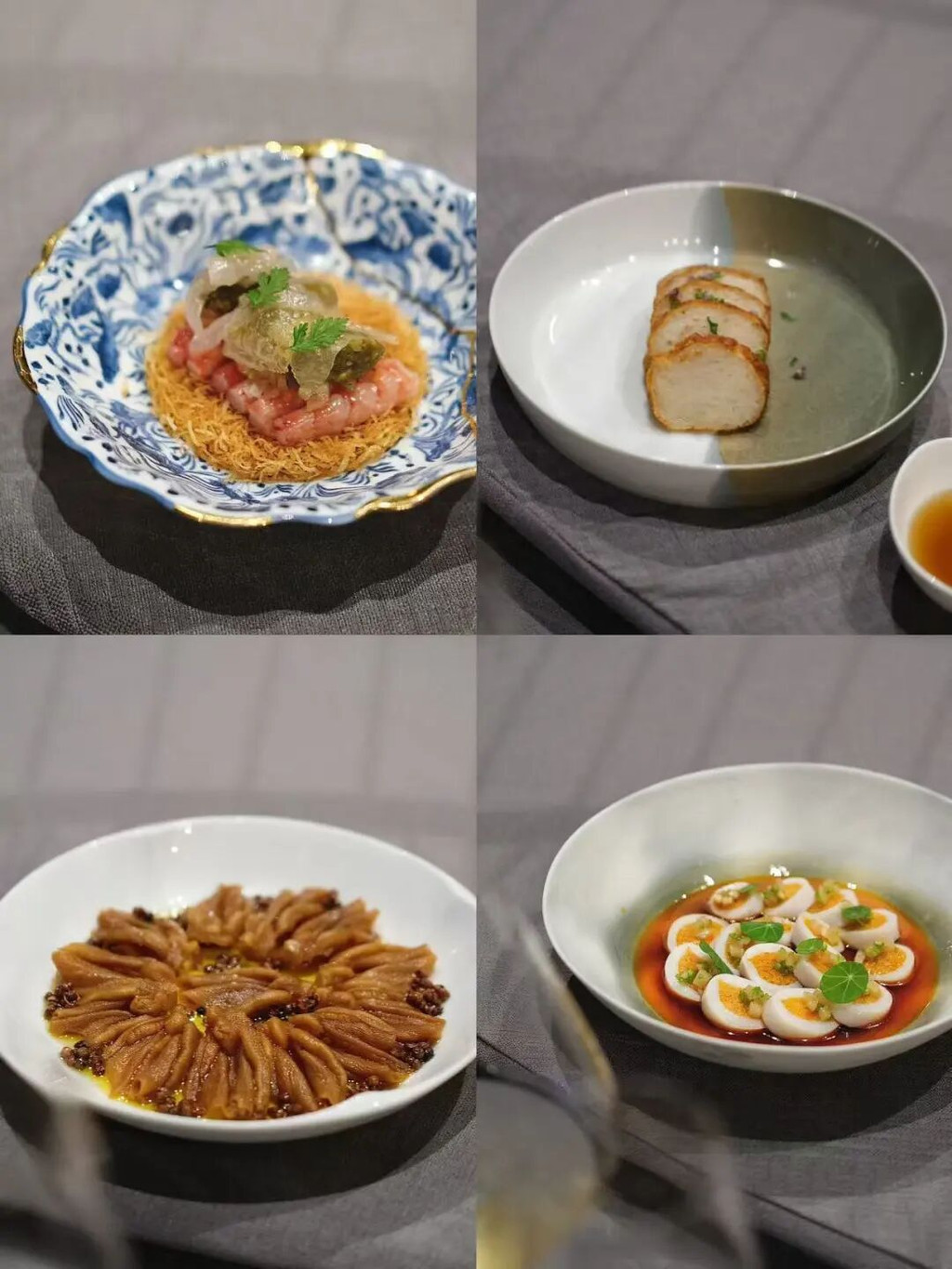 薯松番茄红魔虾、手作温州鱼饼、花椒油浸鸭掌、虾油海胆酿小管