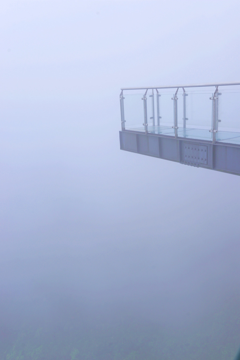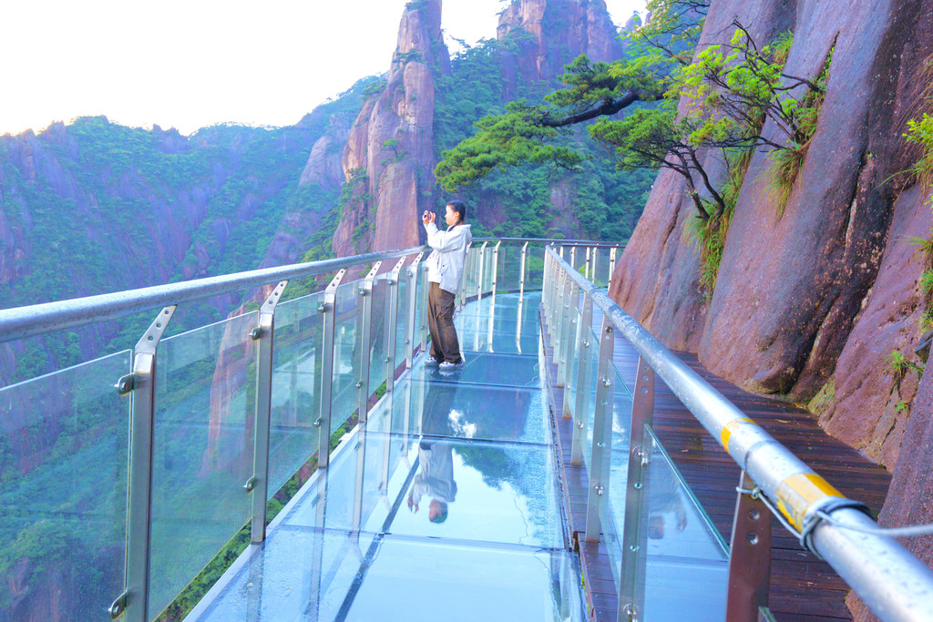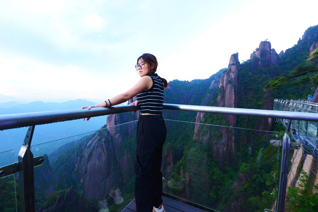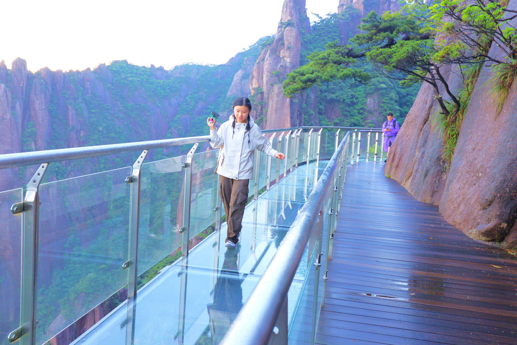 在高空玻璃栈道上行走,更惊险刺激,雨天不让走,她是偷偷跨进去的。