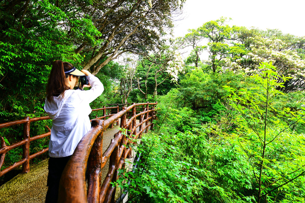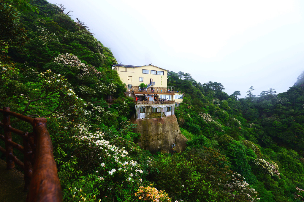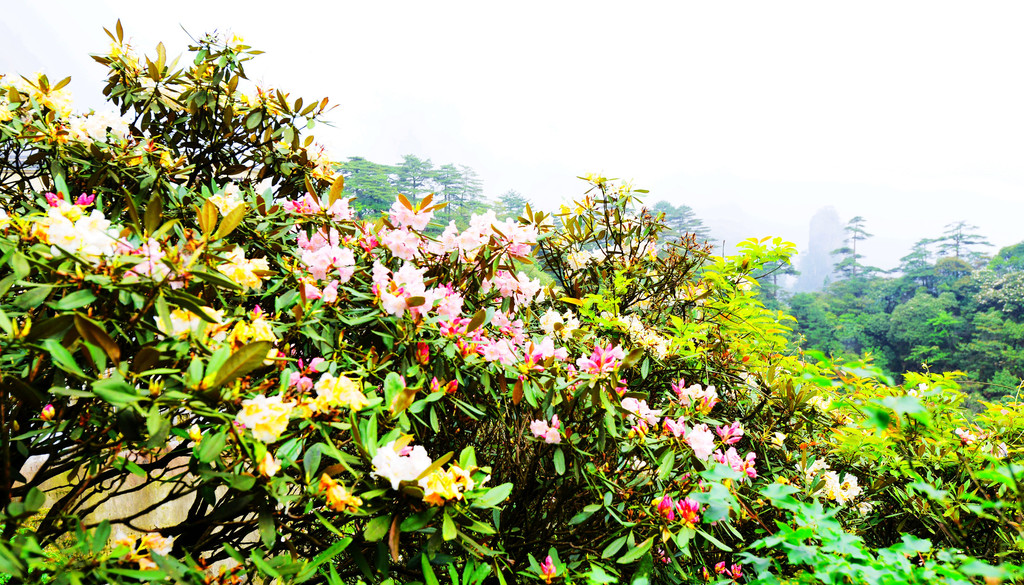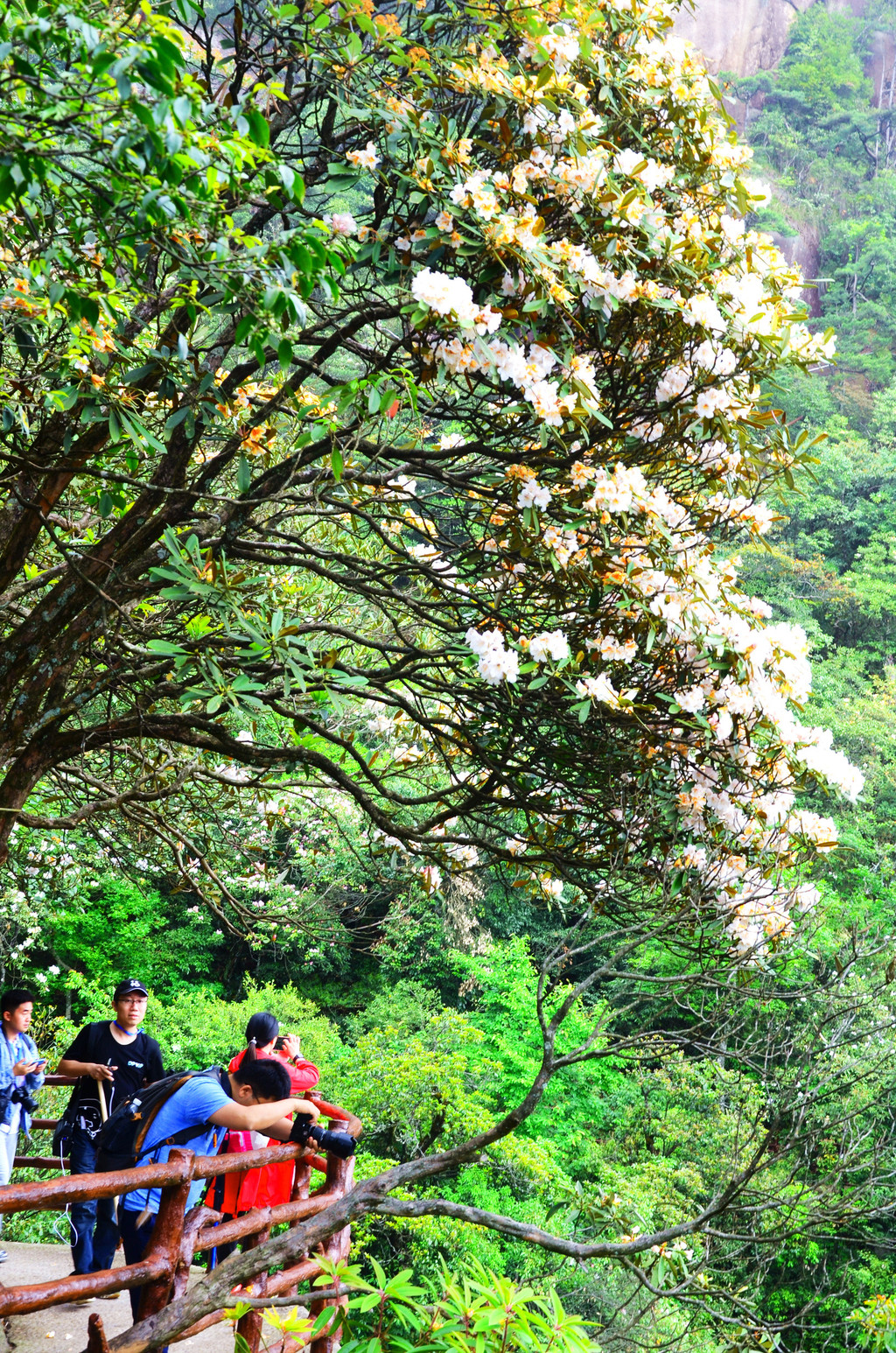 高山杜鹃遍布山谷,有诗赞之:五月三清花如海,红粉紫白次第开;游人举目杜鹃树,万种风情涌上来。
