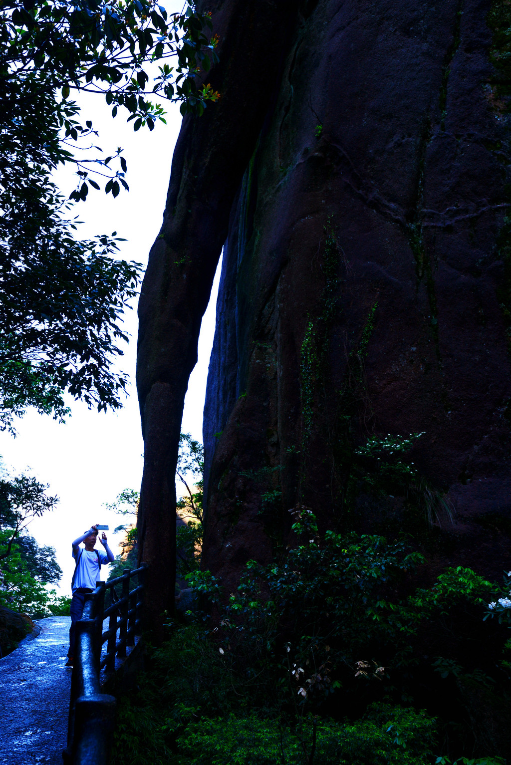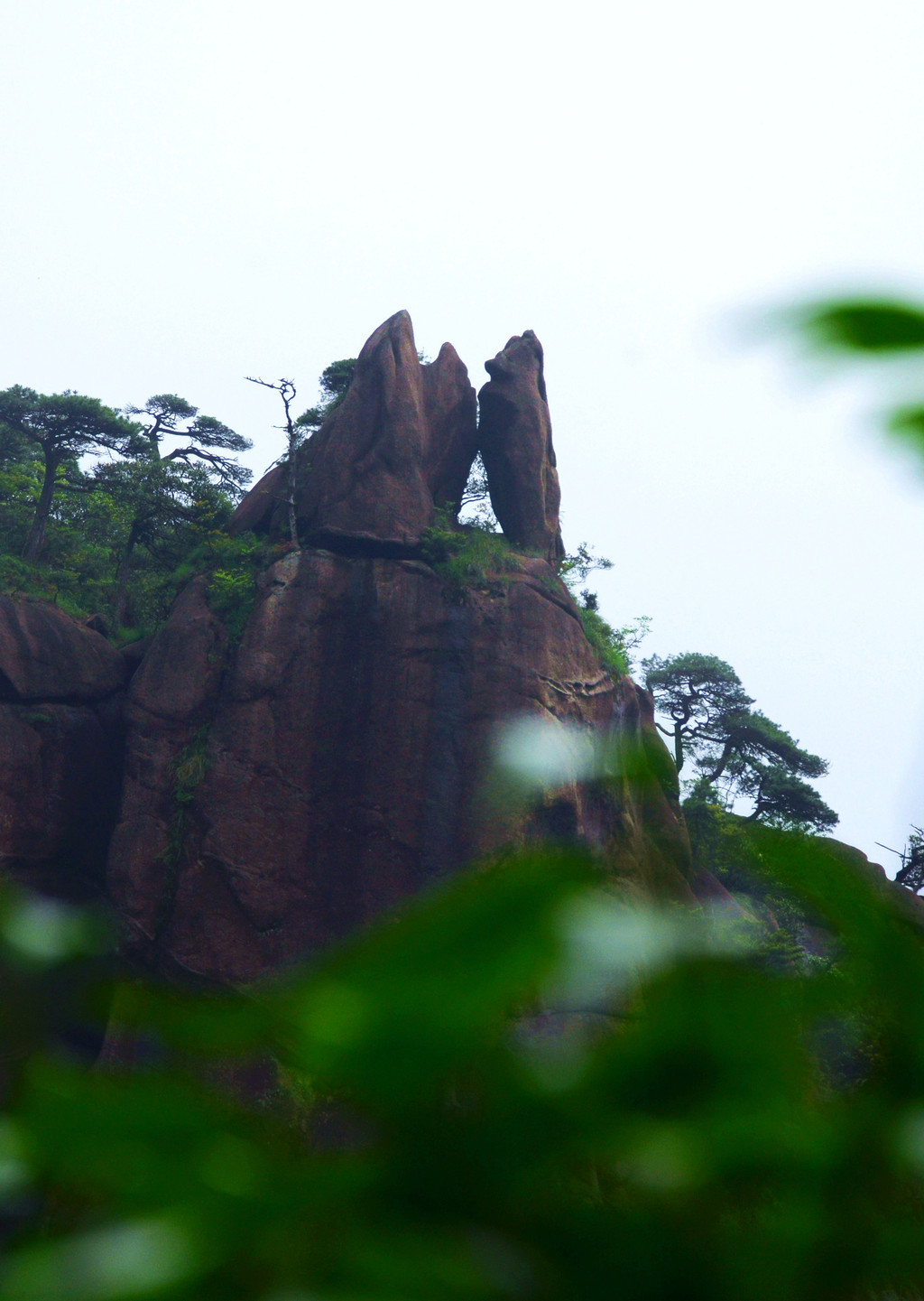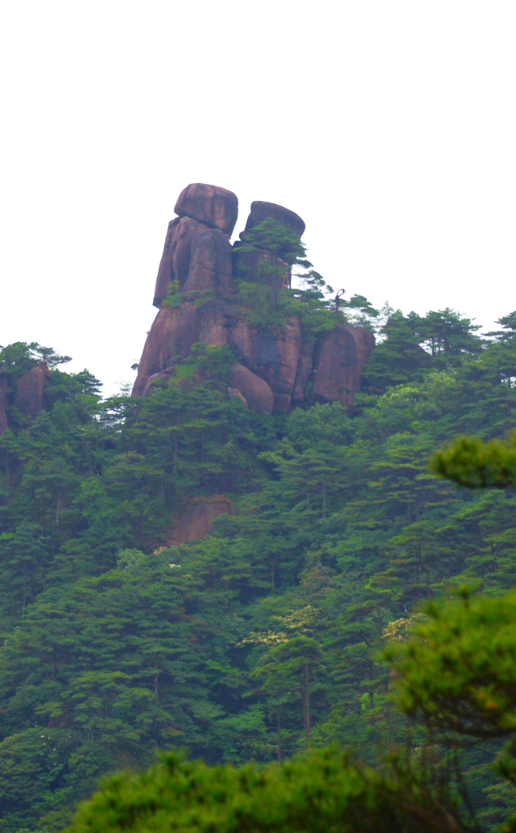 时雨时停,五老朝圣不愿露真容,母子石更别说了,看得到却拍不到,相机对不上焦,雾气把她俩笼罩住了。