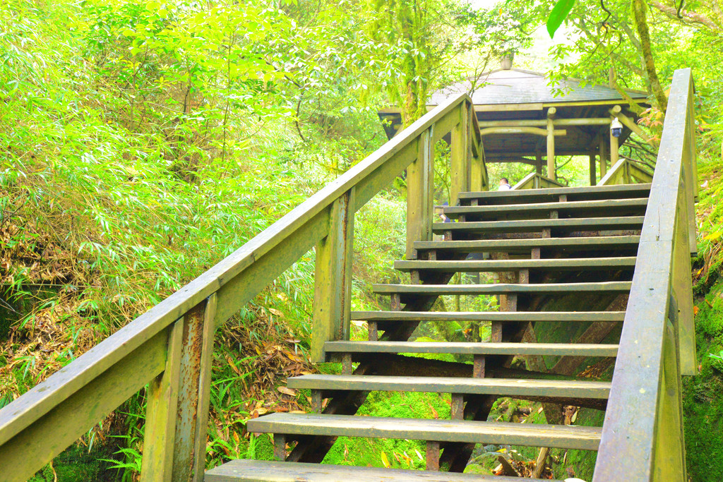 过了福佑台,是一条山间栈道,此为国内首条枕木栈道。