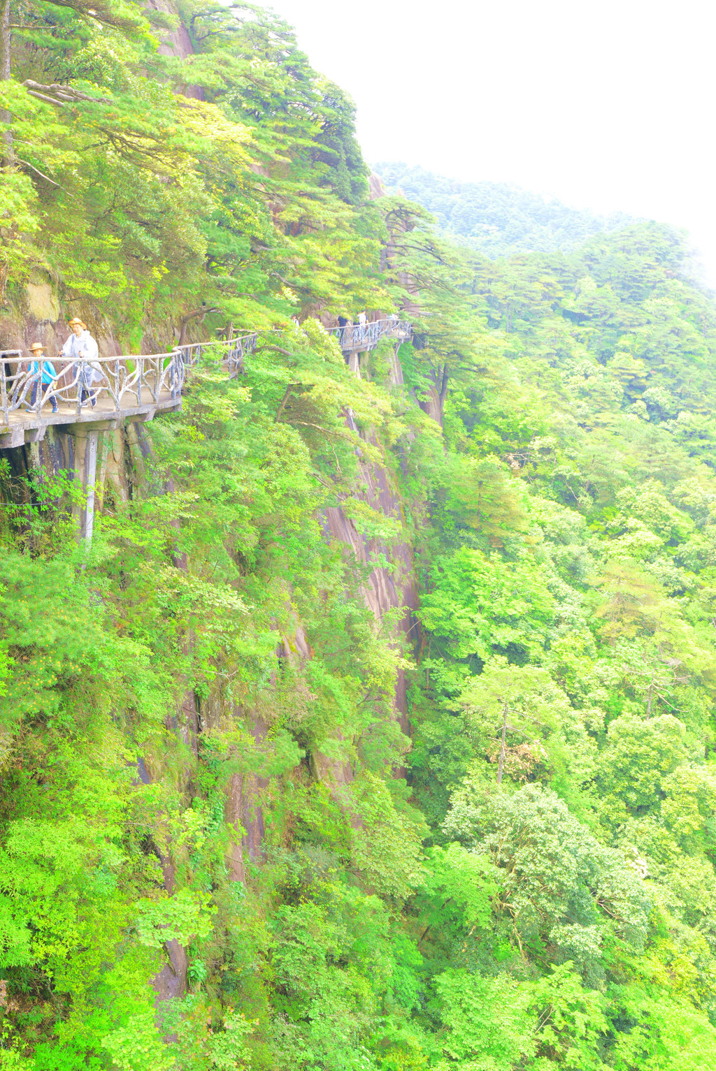 朝回走,选择西海岸栈道这条路,西海岸是三清山最为开阔的景区,这里的海并不是云海,看了介绍才知道三清山曾经三次遭海侵,西海岸就是当年的海岸线。这里海拔1600米,栈道长4000米,是中国最长的悬空栈道,其中的3600米无一台阶,行走其上,如履平地,可览连绵群峰、壮阔云海、幽深峡谷。