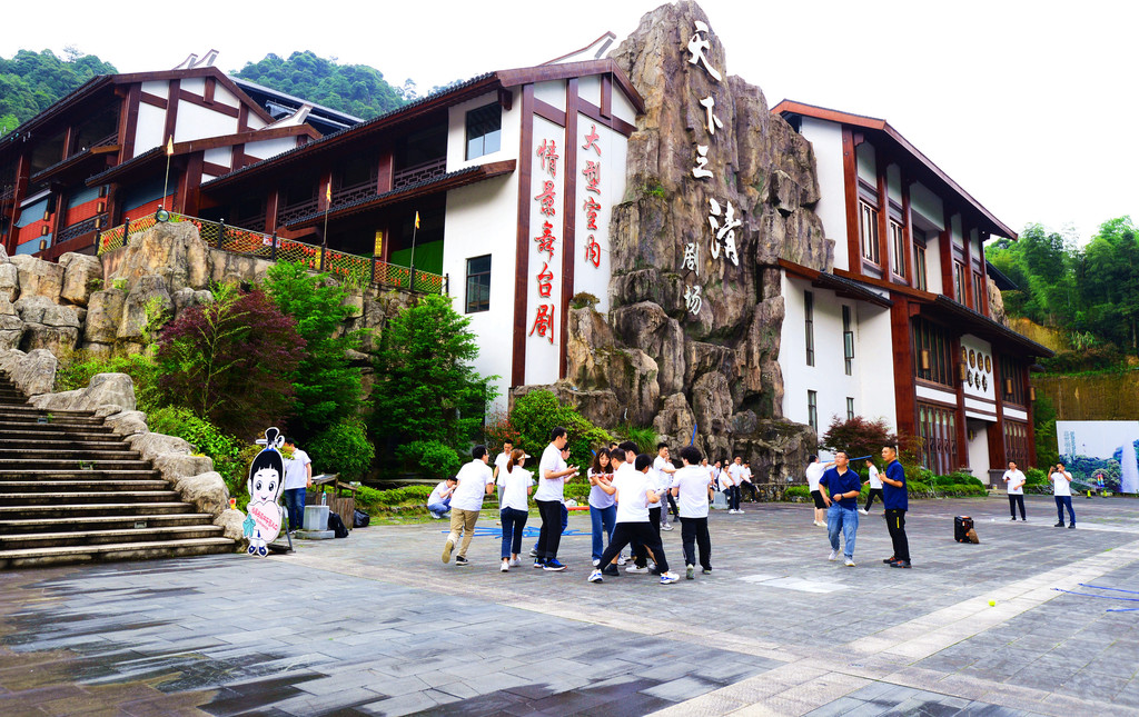 《天下三清》剧场每天有演出,剧场门前广场上的一场团建活动搞得热热闹闹,一伙男男友友在玩游戏时身体不停地互相接触。