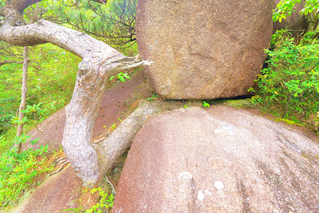 行至一处平台,前方的花岗岩宛如一条长龙紧贴石壁,仿佛在与松树嬉戏,此景称为“神龙戏松”。