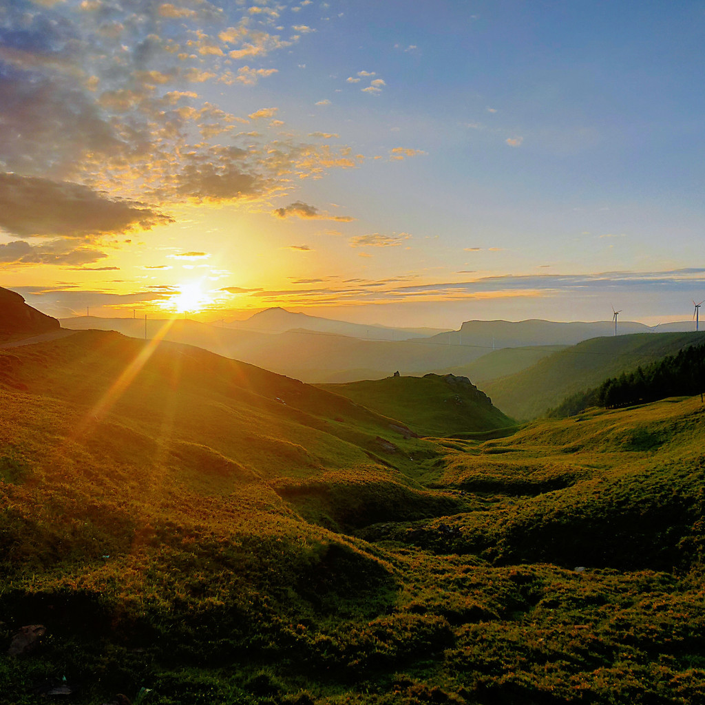 相比日出的绚丽,日落显得更为幽静,斜阳西沉的余晖像流金般灿烂耀眼,远山被夕阳镶上了一道金边,碧绿的草甸开启了暖色滤镜,金色的光芒洒在人的身上,是拍摄大片的不二时间。