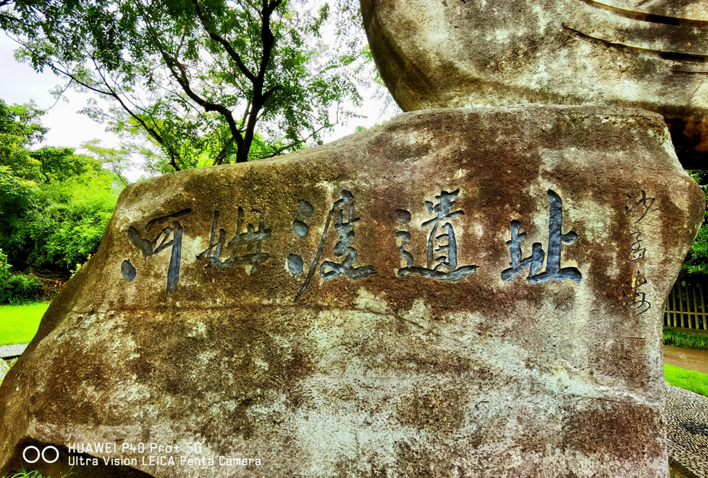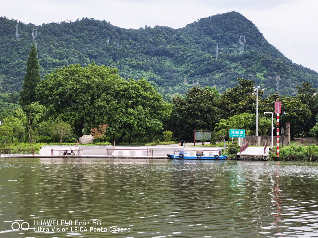 不得而知。河面不宽,河水清澈,河对岸竖有河姆渡的蓝色牌子,还有艘渡船泊在岸边。