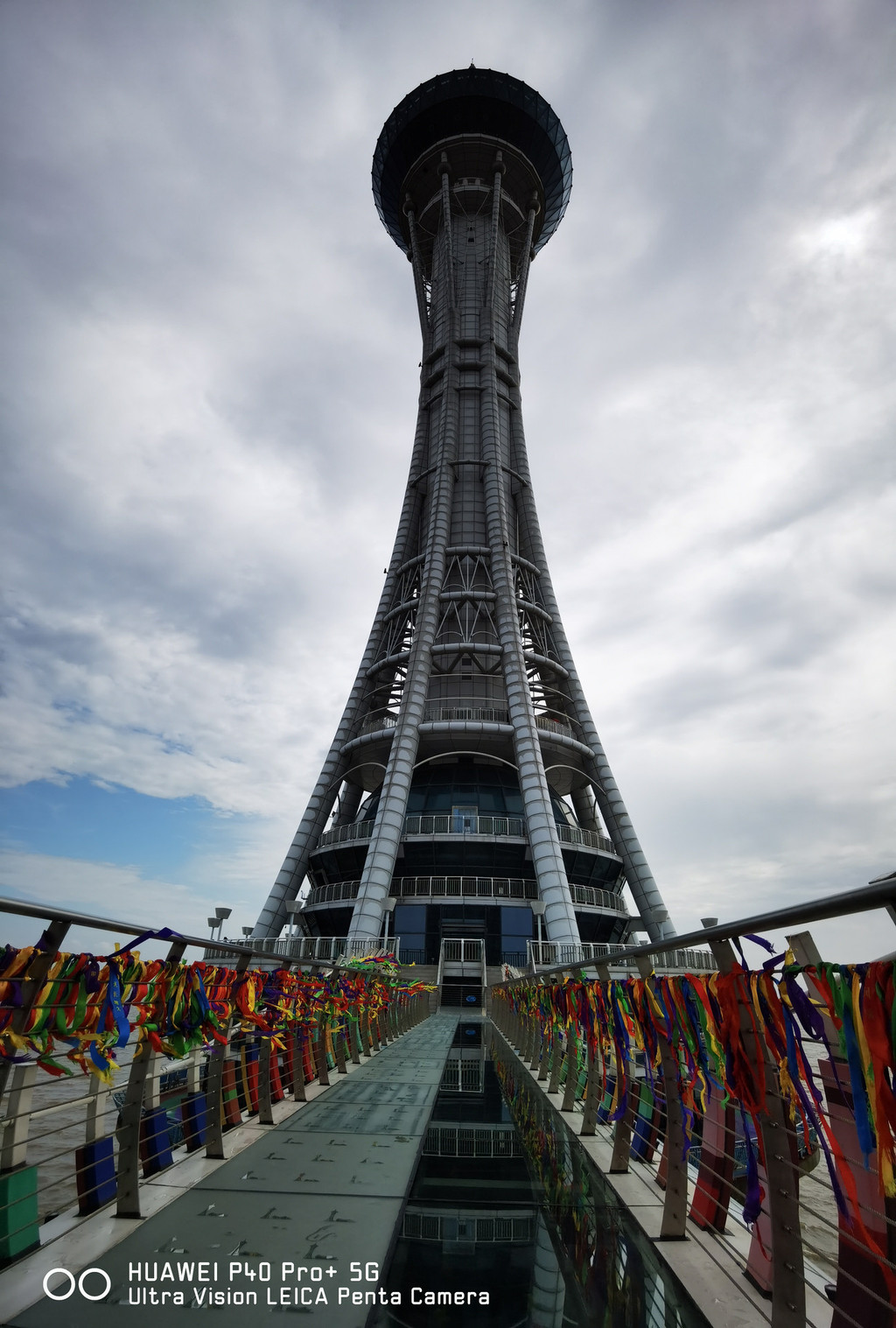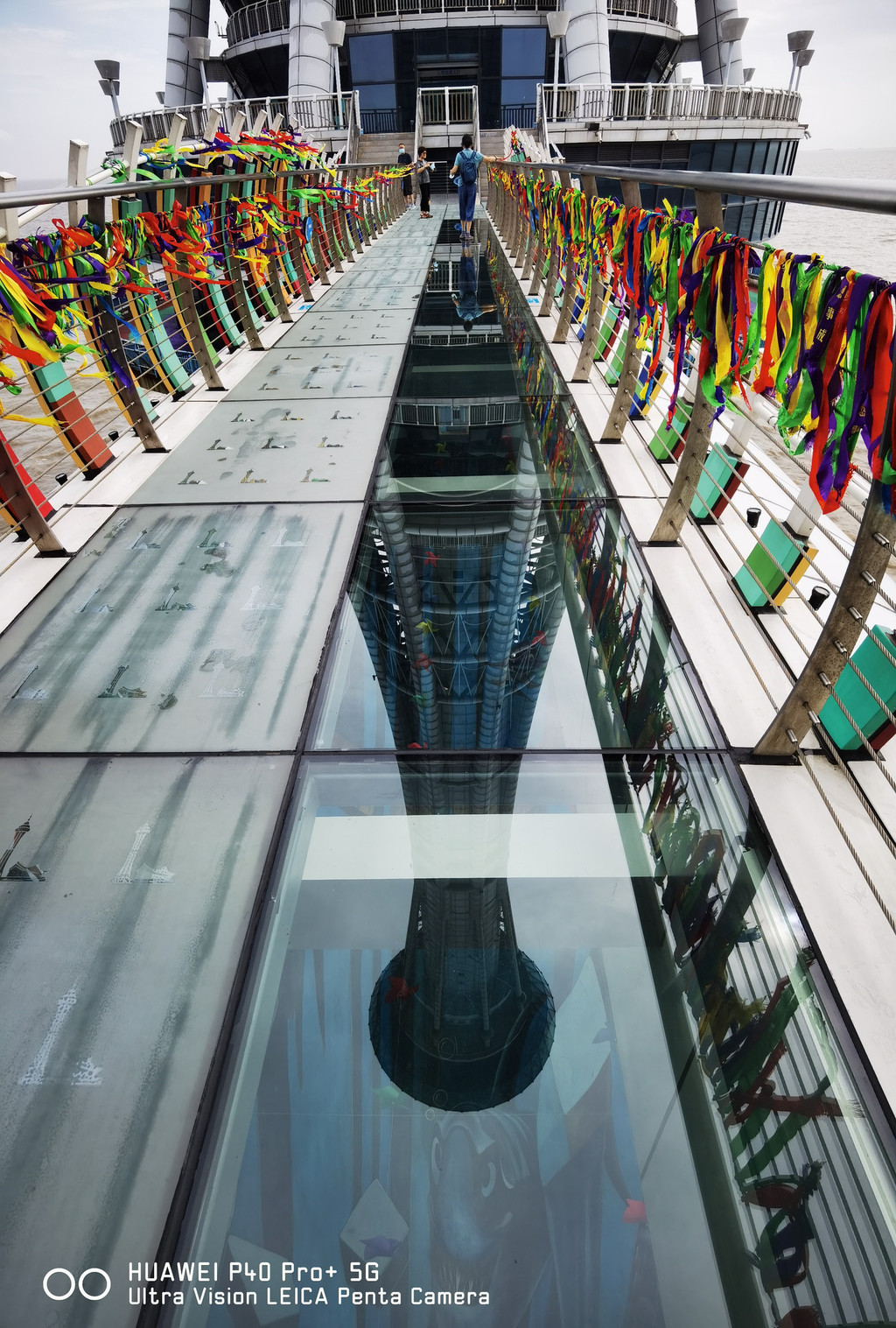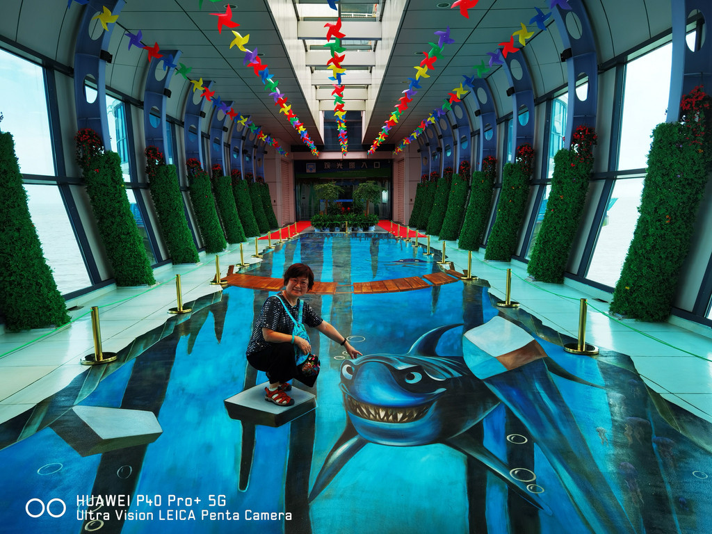 。再步行向上到19层,是户外观光平台,此处可观赏到南北大桥的全景美姿,远处岸边的大山高楼也隐约可见。从观光塔经一层室内彩虹玻璃栈桥返回观景平台,这段桥面上是3D图案,有小桥有鲨鱼,拍摄的照片很有真实感。