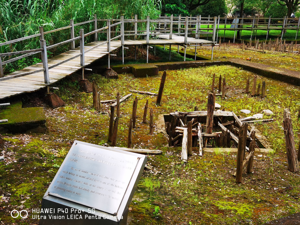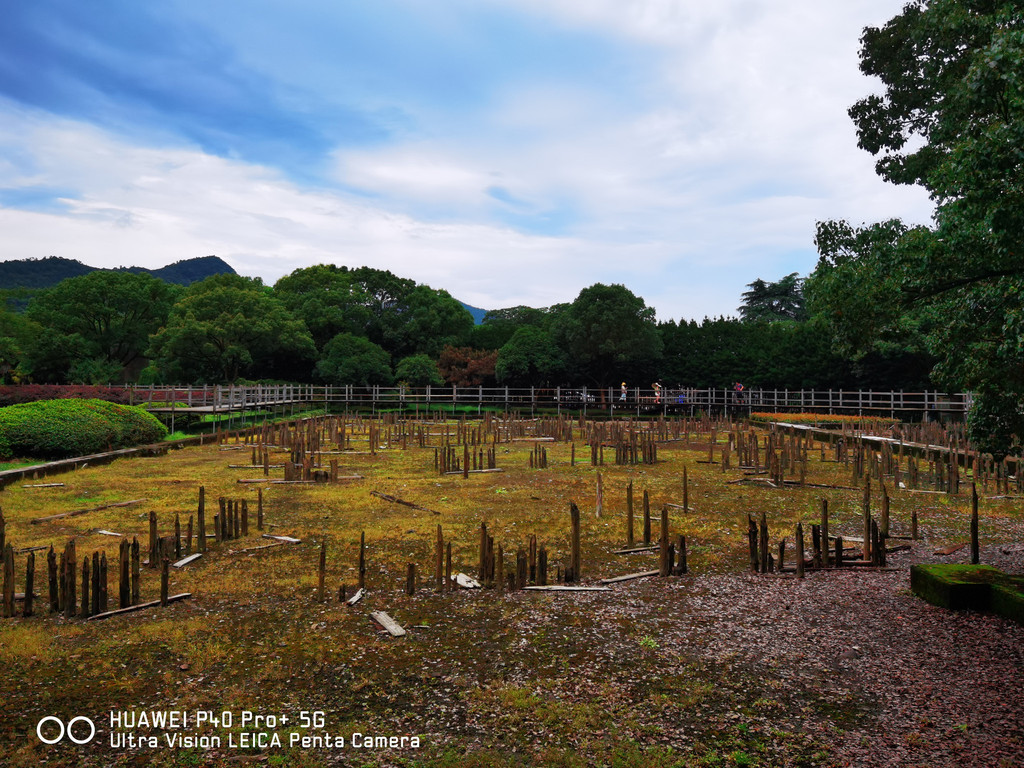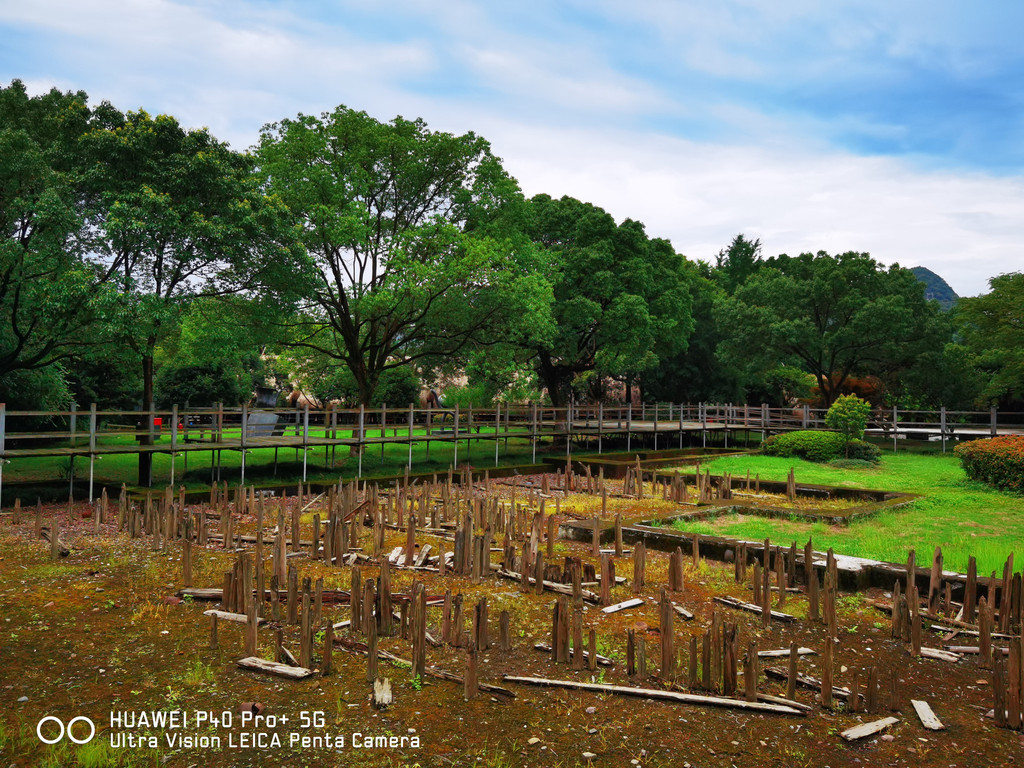 室外展区是挖掘现场发现的河姆渡人居住区,沿木制栈桥一路走去,到处都是干栏式建筑的木桩,