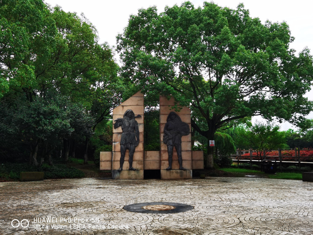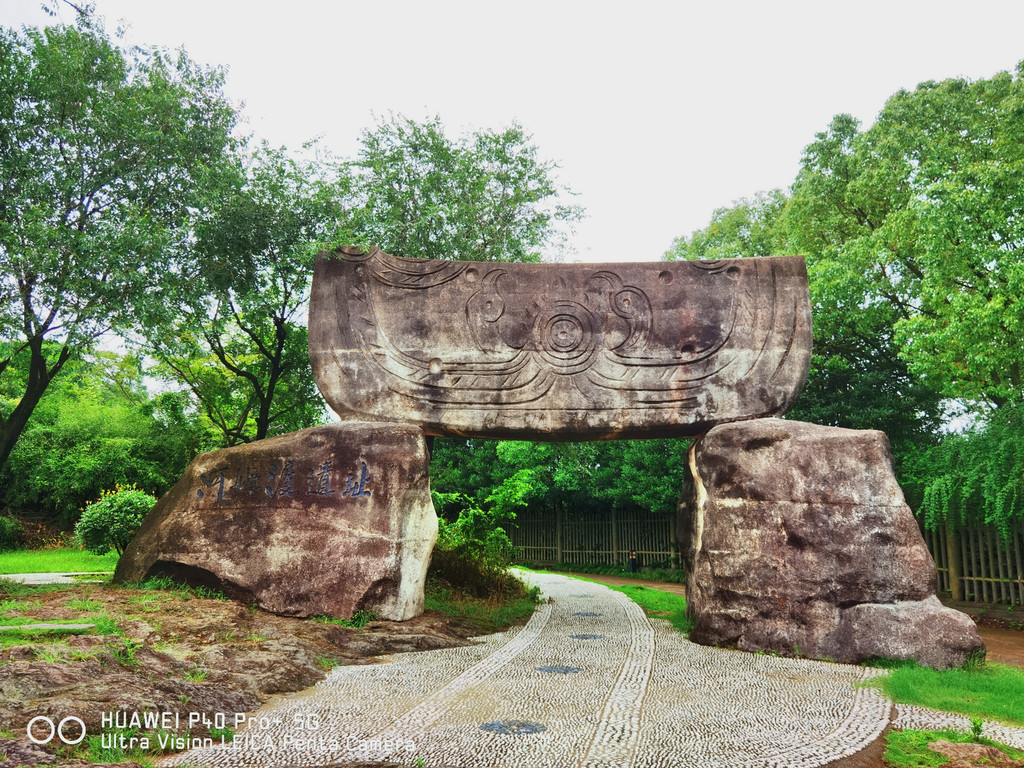 继续向前走就到了河姆渡的渡口了,这里有双鸟朝阳象牙蝶形器形状的大门,