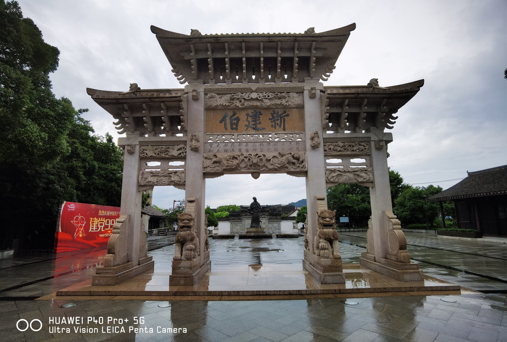现存王阳明故居并非其明代的故居,而是在清代建筑寿山堂基础上进行重修的。故居的广场上矗立着石牌坊,匾额为新建伯,系王守仁的爵位号,