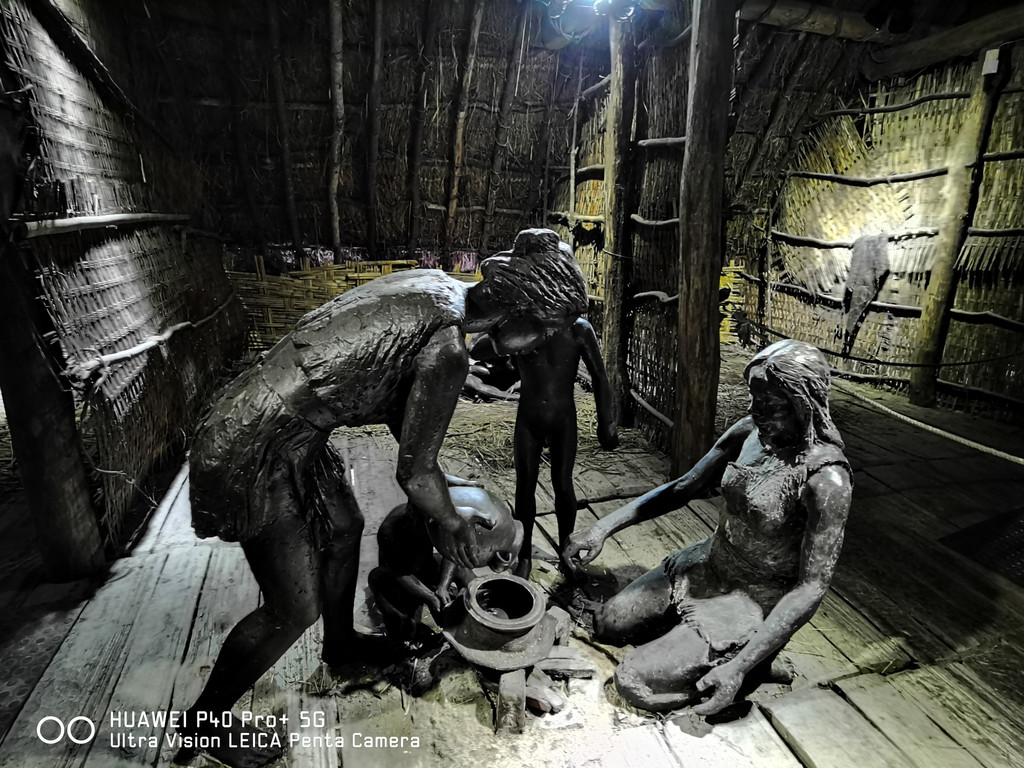 我们走进一幢复原的干栏式房屋,这里展示的是河姆渡人的生活场景,房屋的中间是一条走廊,走廊的中央是火塘做饭的地方,