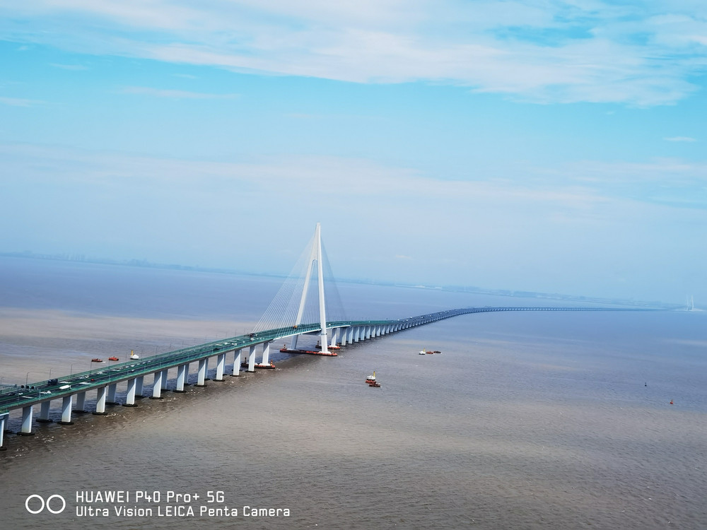 ,气势恢宏的南、北航道桥遥相呼应,北航道桥是双塔型的斜拉桥,南航道桥是单塔型的斜拉桥,虽不对称,但是在观景平台上分别眺望,都是那么的高大雄伟。高耸入云的塔柱像是琴身,而白色的拉索是琴弦,在海风的拨动下,仿佛奏出了优雅的琴声。