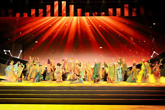 夜幕降临,华灯初上,流光溢彩。文艺演出在开场舞《二十八星宿大型神话故事舞蹈》中拉开帷幕。