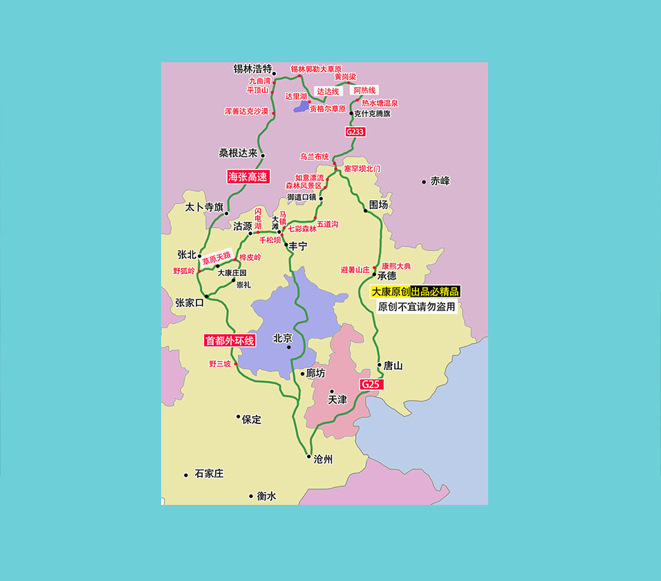 锡林郭勒 大草原相对于坝上草原路程更远,需要的时间也和财力也更多。可以根据自己的状况合理安排,下面是路线图和沿途的景点。通往大草原的路上有、沙漠、湖泊、河流、最美自驾公里、 草原天路、达达线、阿热线、温泉胜地、 大兴安岭 最高峰、黄岗梁。这一路算是很多人一辈子向往的地方。