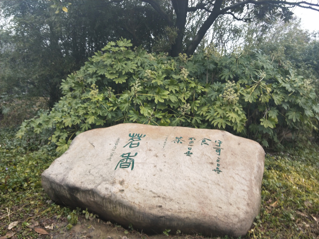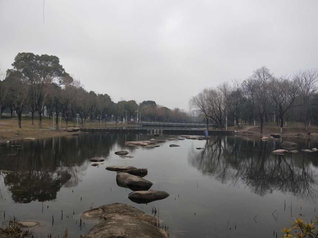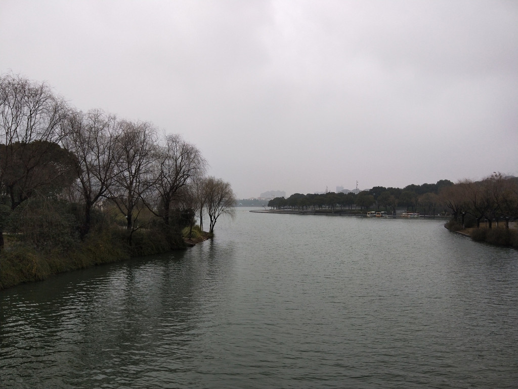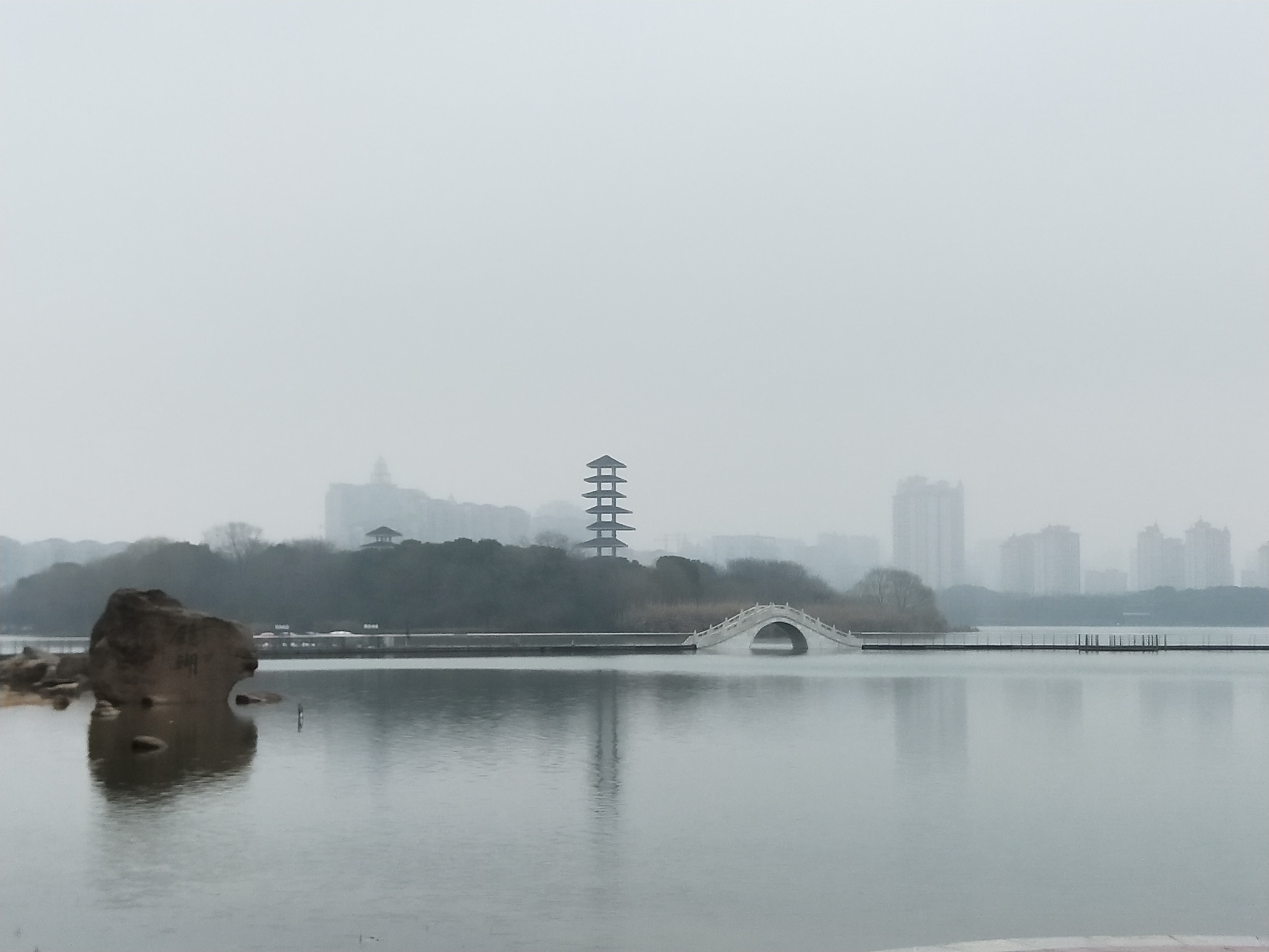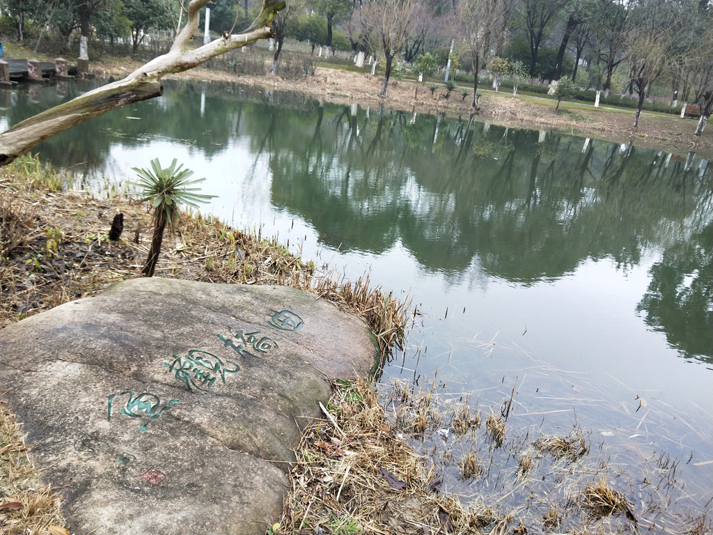 附近有一块大石头,上面刻着“曲桥观鱼”,想来我们刚才走过的折桥,就是所谓的“曲桥”了。为了这“观鱼”二字,我们忍不住又好奇地走回去,好像也没有看到鱼,不知道是不是因为今天天气寒冷,鱼儿们都躲在水下。