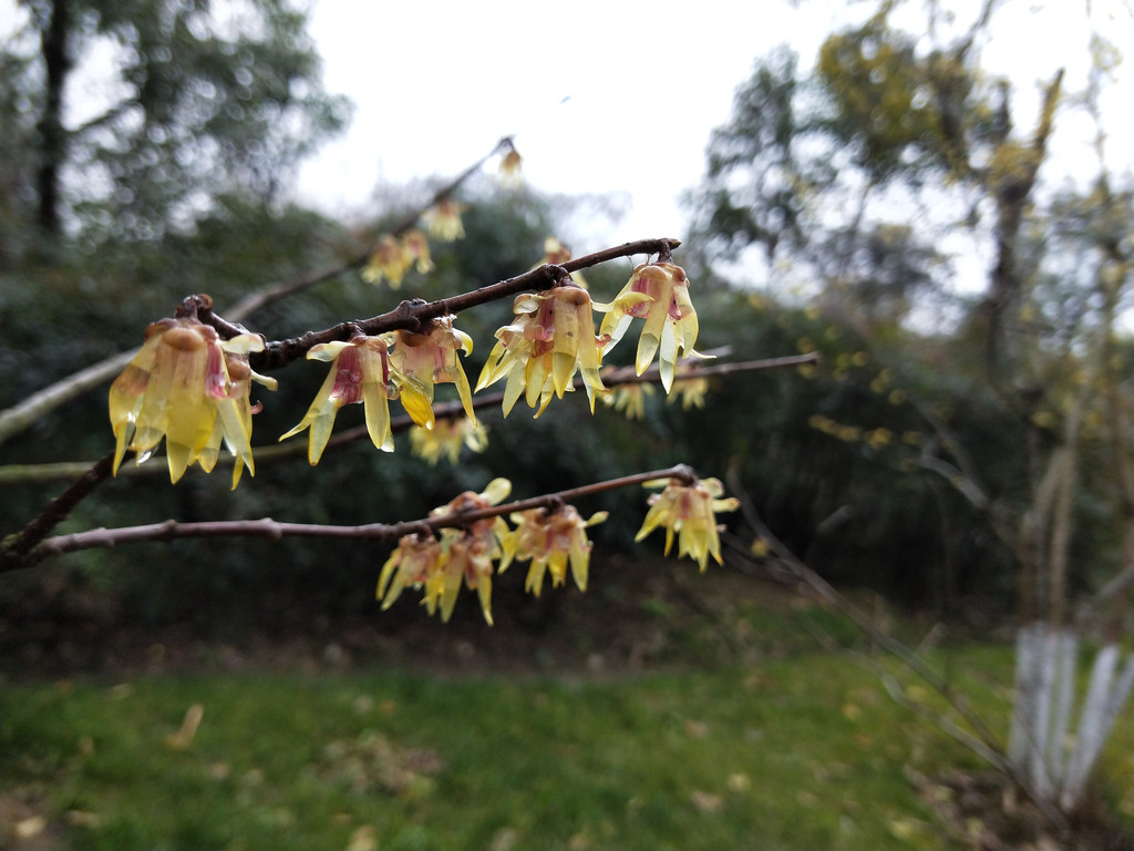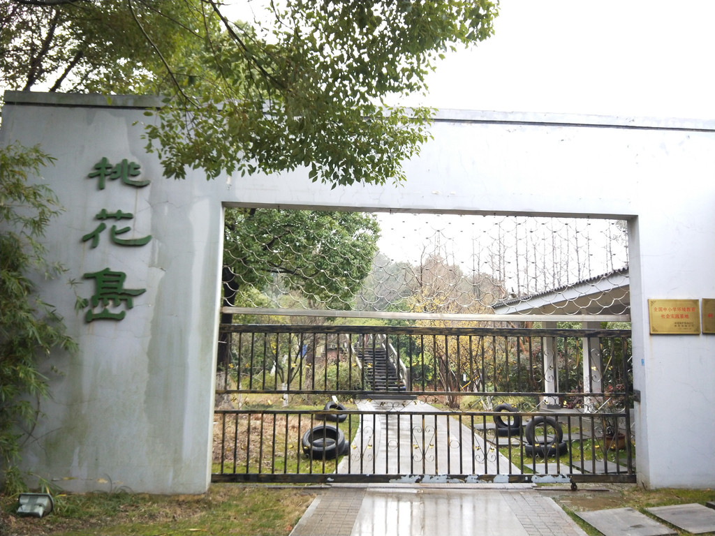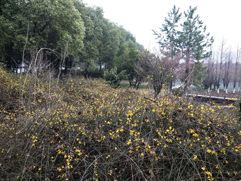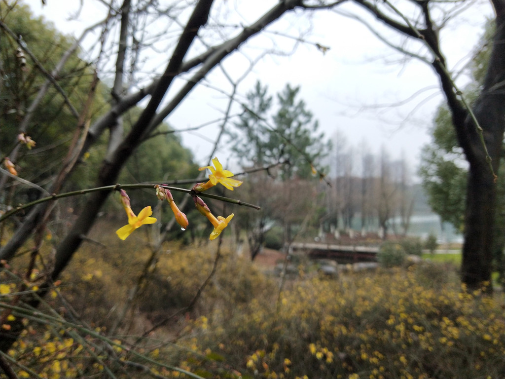 旁边还有一座小岛桃花岛,只是如今也不是桃花盛开的季节,看着也挺萧条的样子。一扇铁门也关着,可能平时压根儿不开放吧。倒是旁边的茶梅开得不错,红色的花朵点缀在绿叶丛中,也算是冬雨中透露出来的一抹亮色。