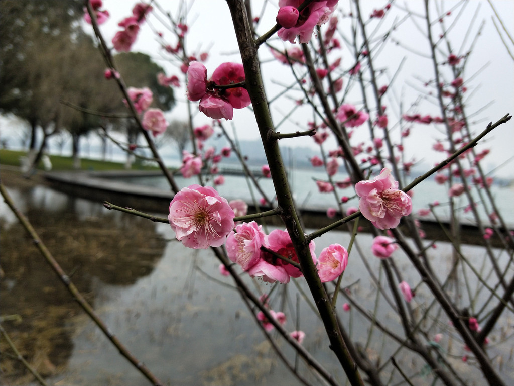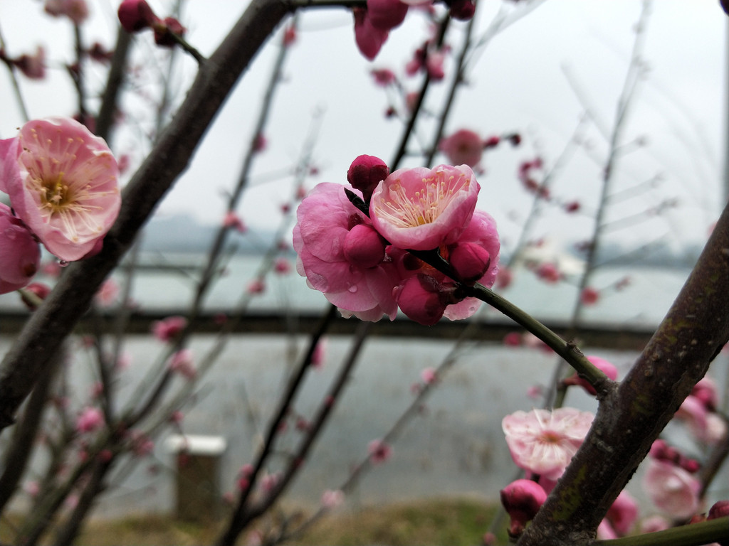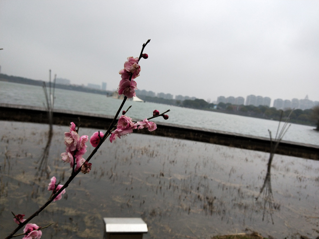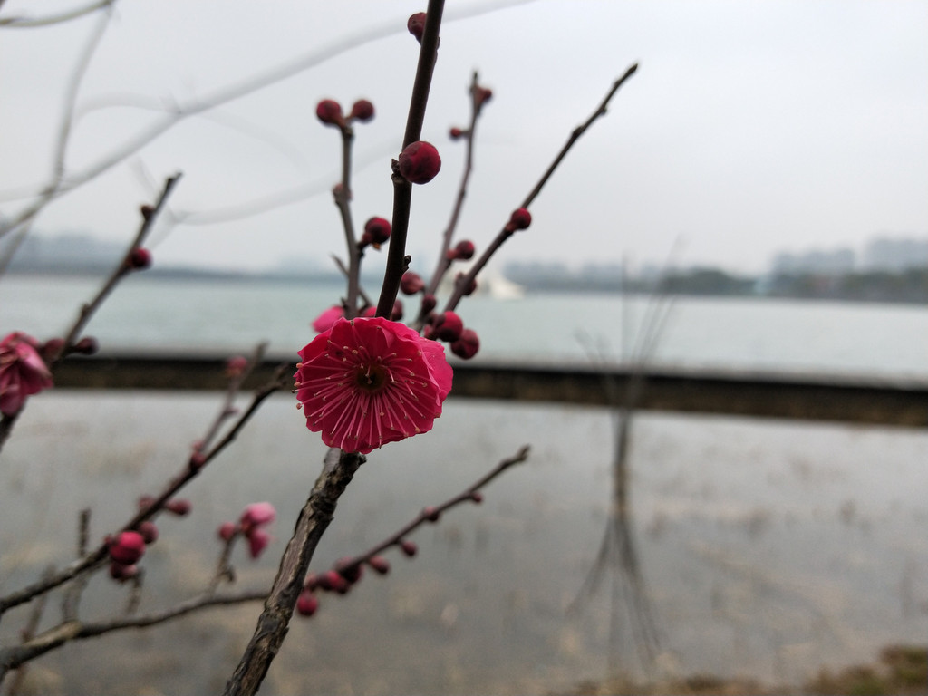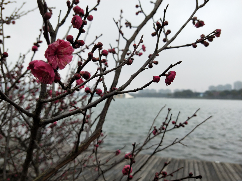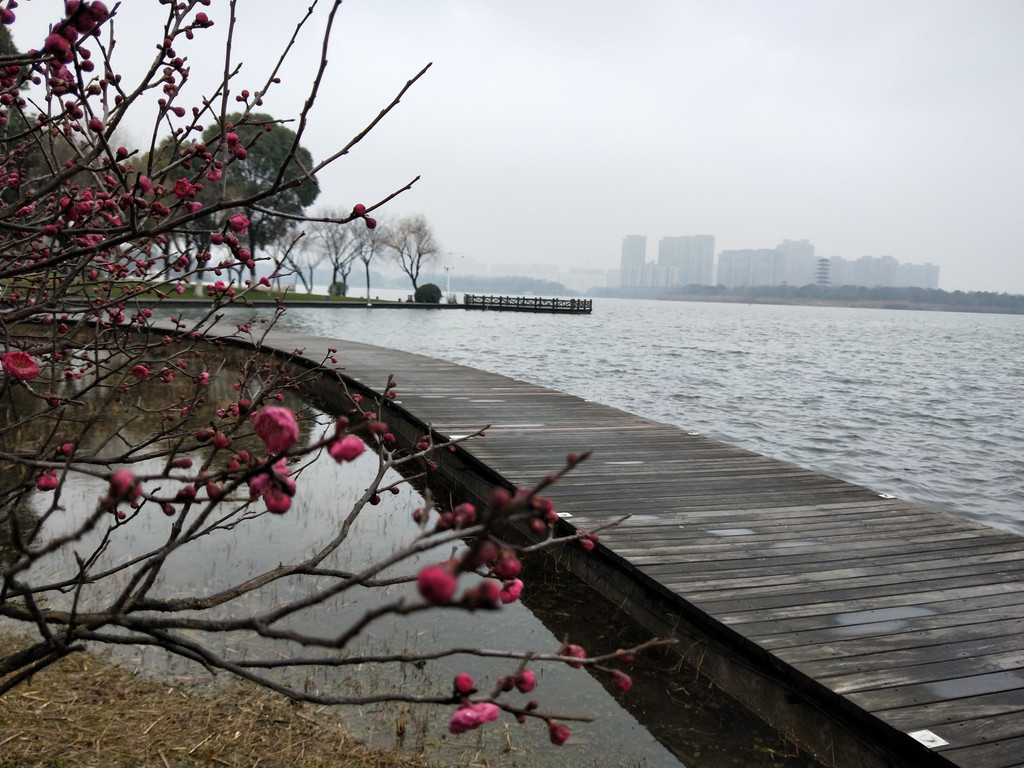 沿湖有一条木栈道,道旁的梅花虽然还没有开足,但也有半数已经盛开,鲜艳的色彩和淡淡的幽香,也算是冬日里最好的景色了。旁边是开阔的暨阳湖,难怪这里的梅花似乎开得要更晚些,湖边的温度更低些啊。