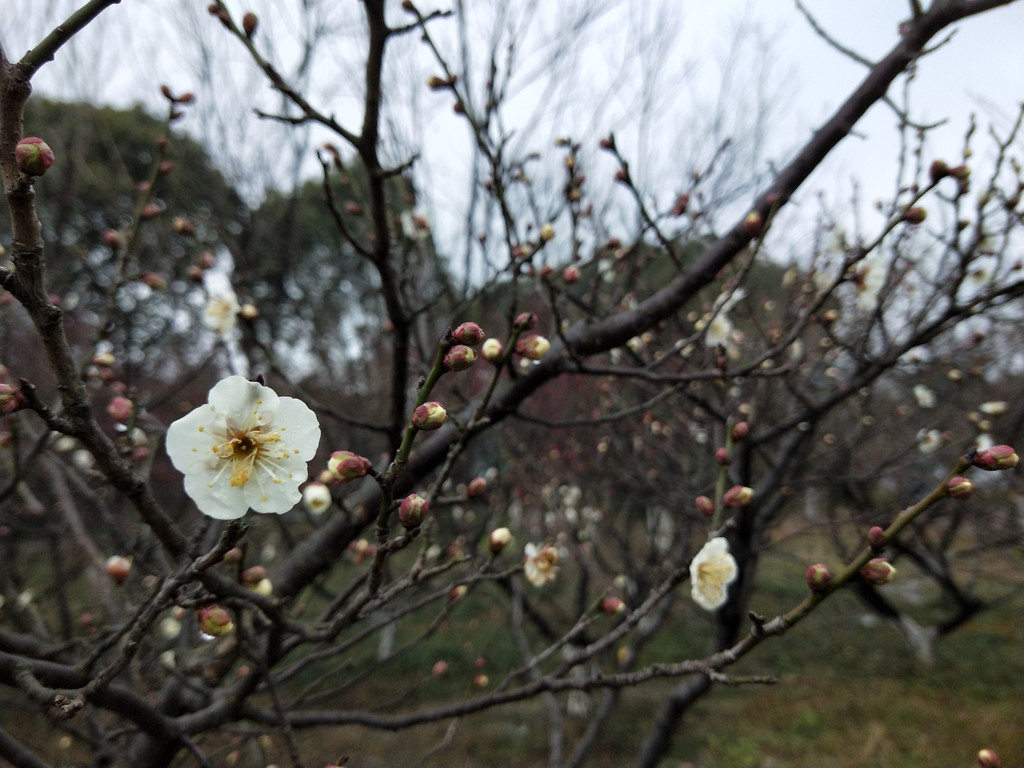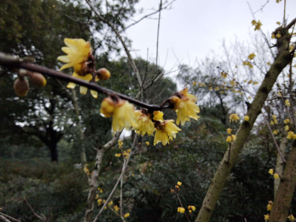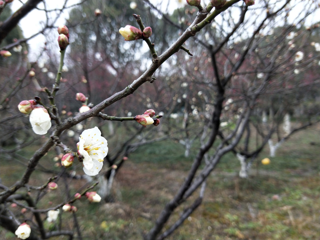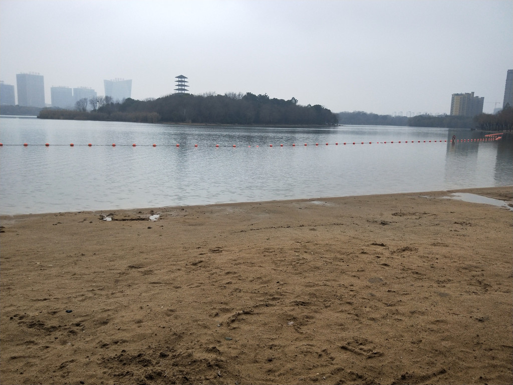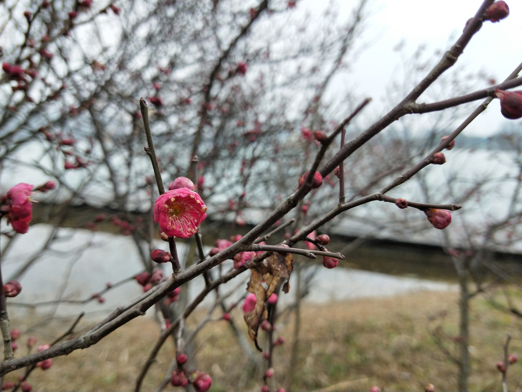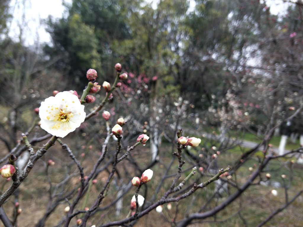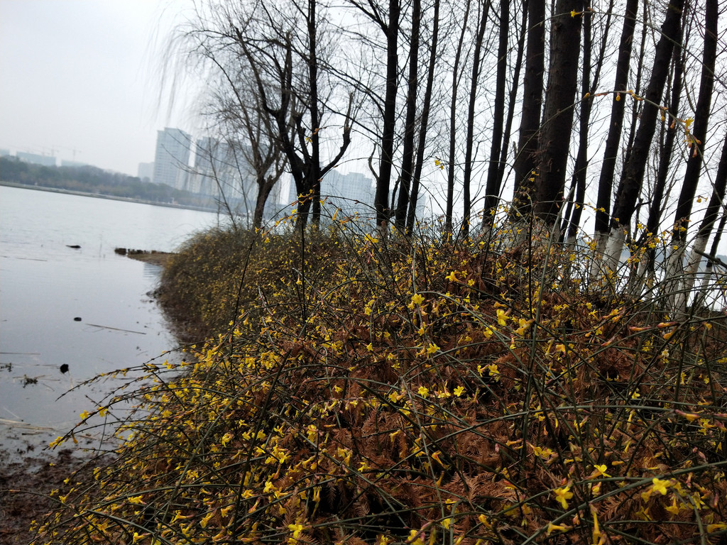 沿湖有一条木栈道,道旁的梅花虽然还没有开足,但也有半数已经盛开,鲜艳的色彩和淡淡的幽香,也算是冬日里最好的景色了。旁边是开阔的暨阳湖,难怪这里的梅花似乎开得要更晚些,湖边的温度更低些啊。