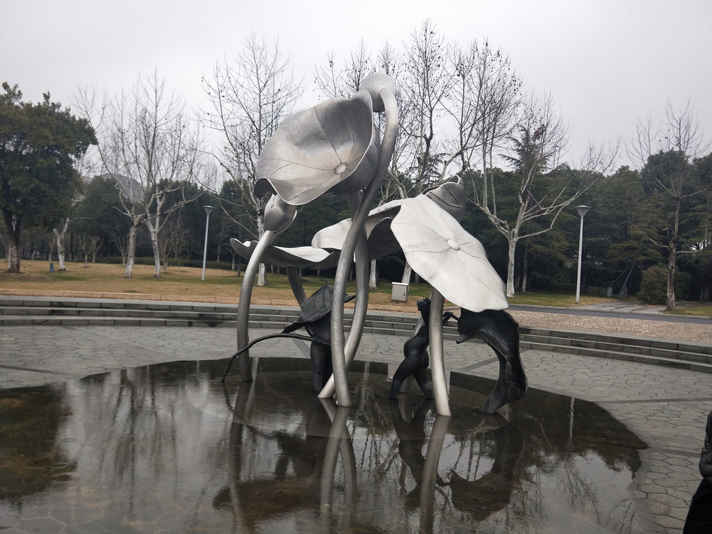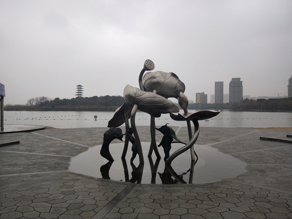 栈道的尽头,有一组荷花雕塑,材质用的是不锈钢,在水池里倒也显得婀娜多姿。不过,荷花季节才算应景。