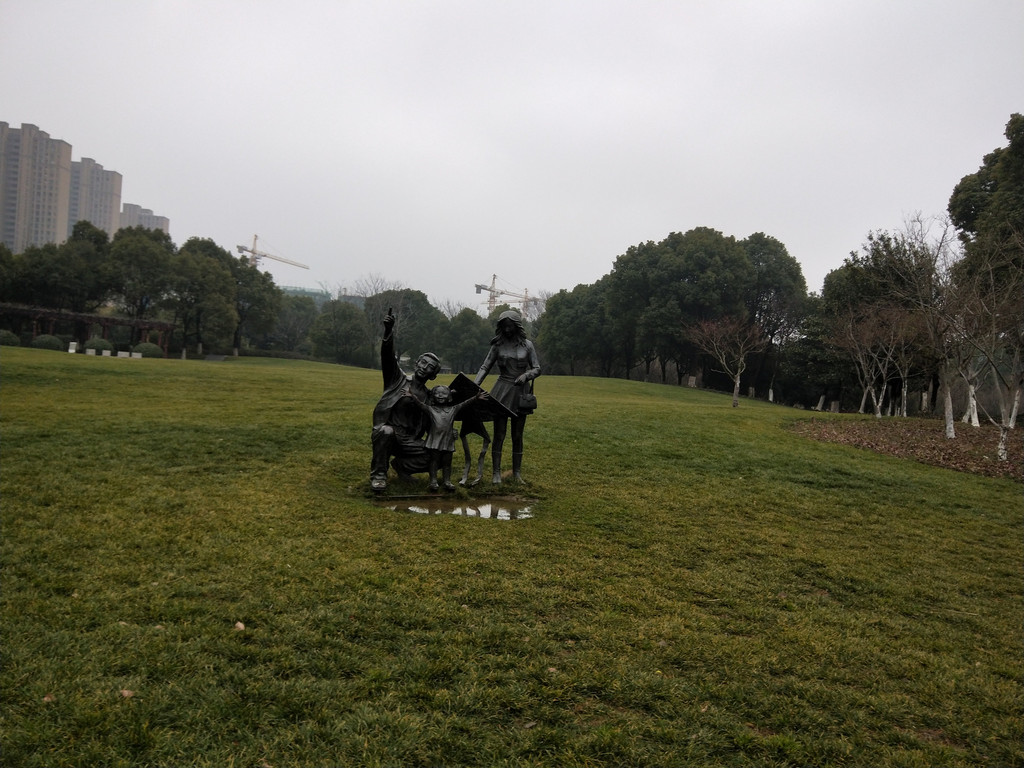 阳光大草坪范围还挺大,风和日丽的时候,扎个帐篷铺张地垫,倒是很惬意的闲暇时光。草地上有一组雕塑,典型的一家三口,正亲亲热热地在说着什么。小女孩张开双臂,而父亲而蹲着,似乎在给小女儿科普着什么。