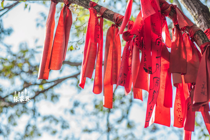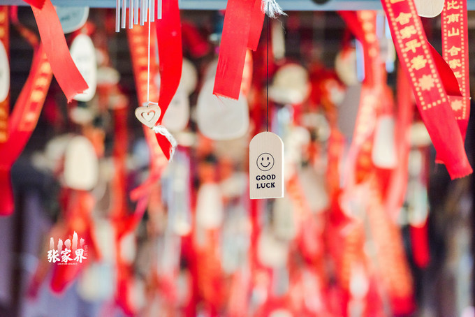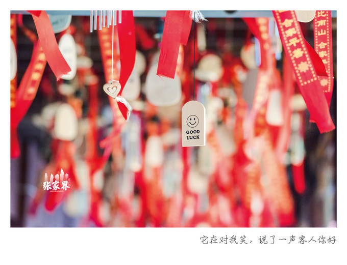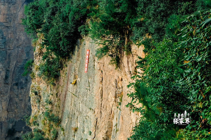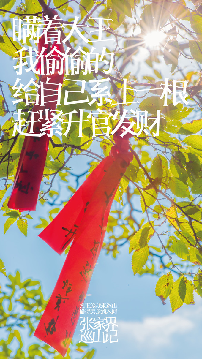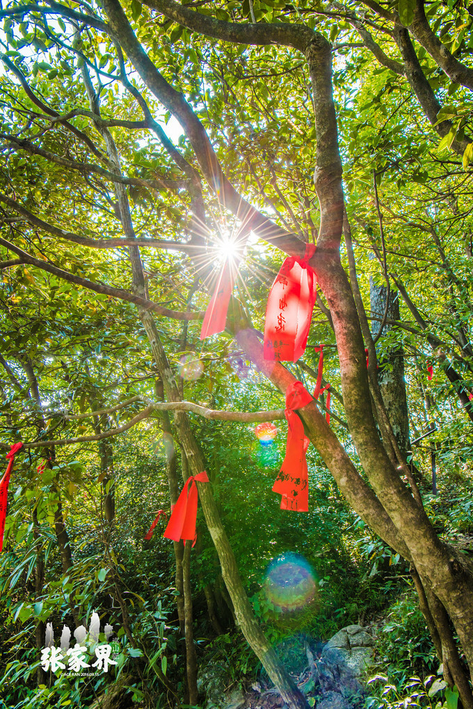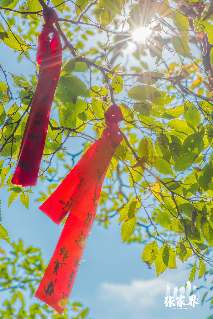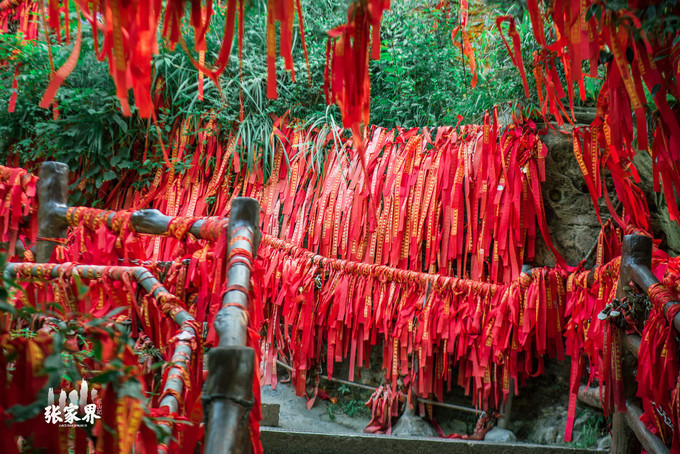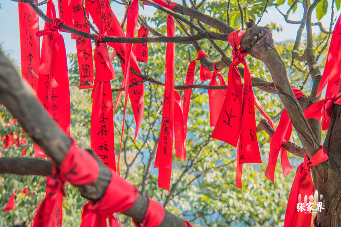 张家界天门山景区走不多远就看到一片红,离近看树上栏杆上缠绕的都是写满祝福语的红飘带,在一大片绿光中显得格外醒目,场面非常壮观,这就是 天门 山著名的景点——许愿林。