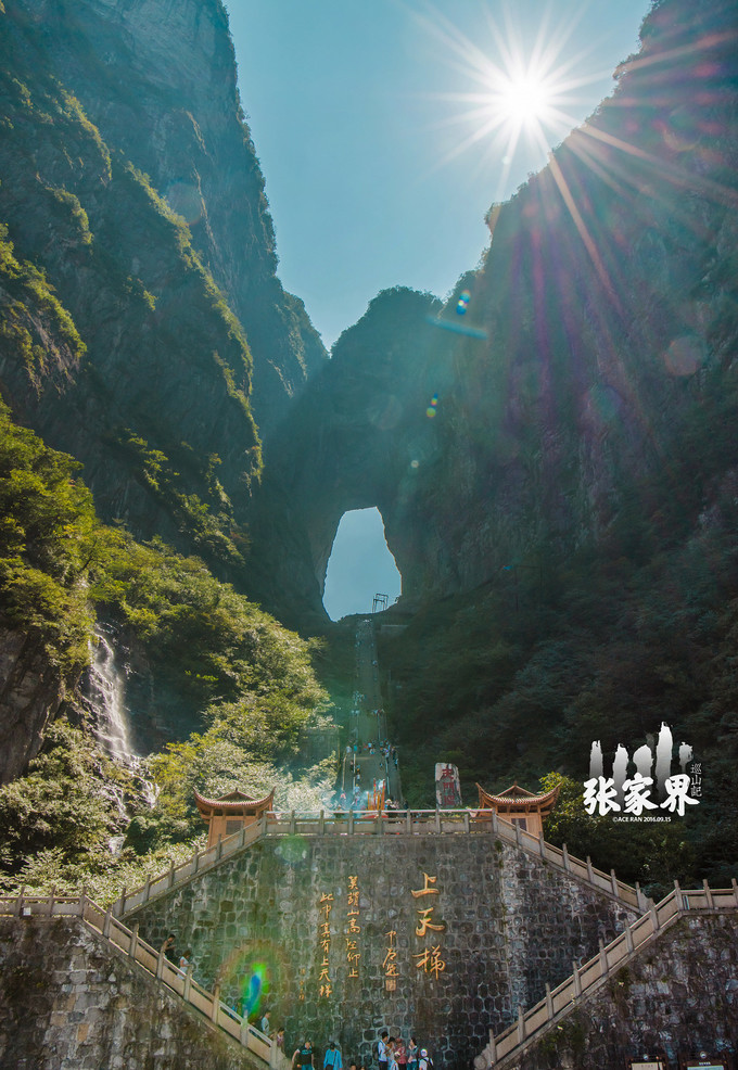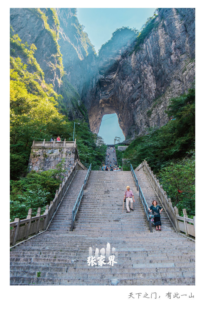 天门洞和我家冉先森平时因为工作原因大部分时间都是坐在电脑面前,基本不运动,这一下子爬这么多阶梯简直是要累惨我俩,虽说应该一步登天,不能停歇,但因为很陡,我们俩就是走走停停好在最后也爬上去了,只希望回去能瘦一点吧,哈哈。后头望望走上来的路真是吓人,最下面的人都像小蚂蚁似的。不过这里要说明一下的是,如果带老人过来,觉得爬这里有困难在山的左侧也有直达山顶的自动扶梯,所以不用担心实在爬不上来的问题,但是真的爬上来也就没那么害怕了。