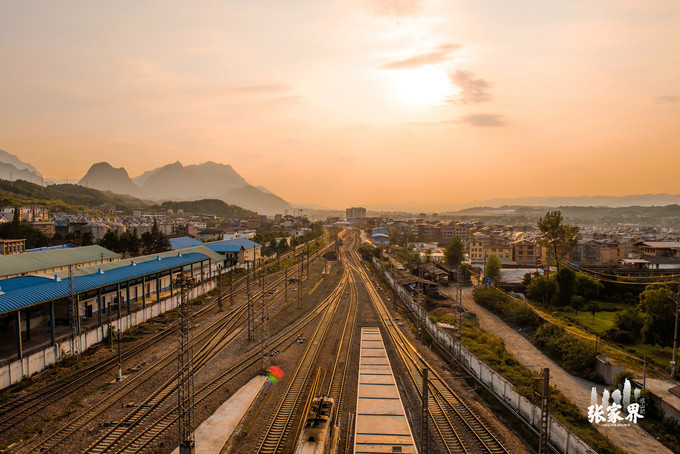 天门山索道天门山索道天门山索道当索道快到终点时经过 张家界 火车站,落日余晖洒落在弯曲的火车轨道上,简直美极了,冉先森抓拍到这美好的瞬间。