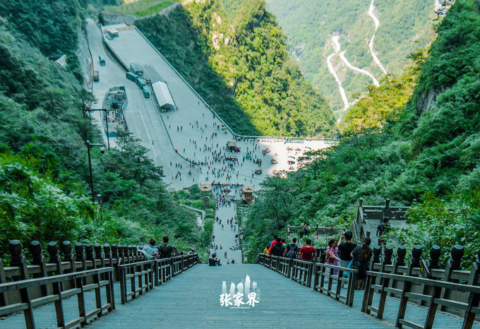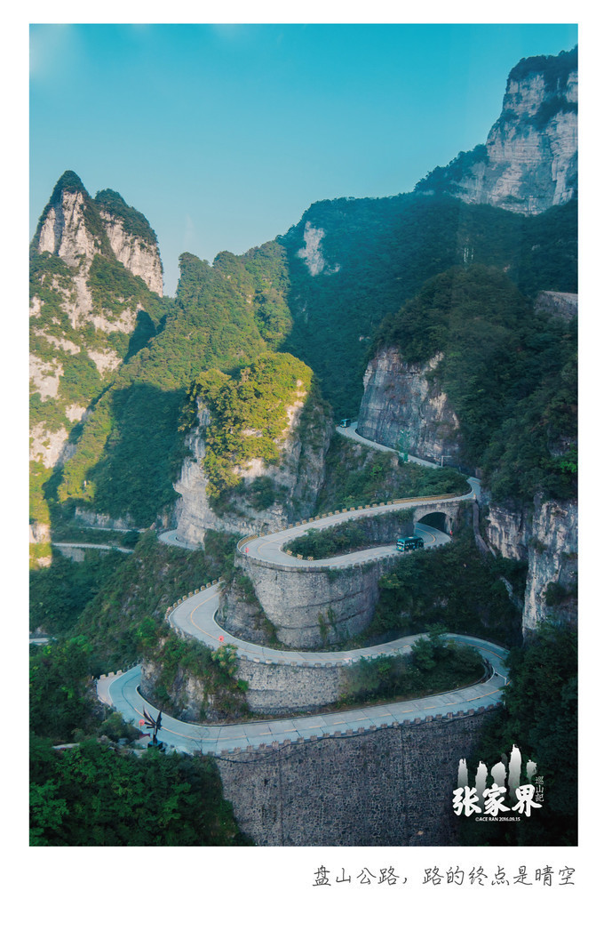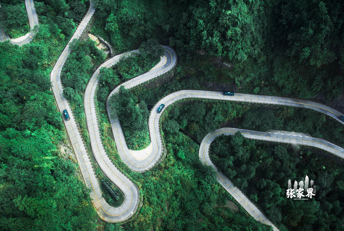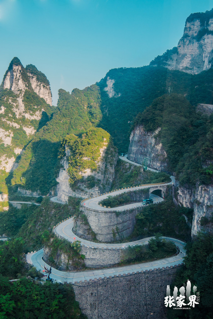 天门洞天门 山是 张家界永定 区海拔最高的山,通天大道态势险绝,荡气回肠,更以蜿蜒迂回穿行于山体绝壁之天险而“堪称天下第一公路奇观”。它全长10.77公里,从标志门直达 天门 洞脚下,海拔从200米急剧提升至1300米,共有九十九个弯,大道两侧绝壁千仞,空谷幽深,180度的急弯此消而彼长,层层叠起,通天大道共计九十九弯,扣合天有九霄之意。大道借山势扶摇直上,如巨龙翔起,似玉带斜挂,一百八十度急弯回峦盘绕,经此通天大道,即可直达上天梯,壮观的天界气象近在眼前。 小心翼翼往下看了一眼来时的路,有种吓尿的感觉,想想都后怕。