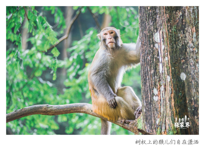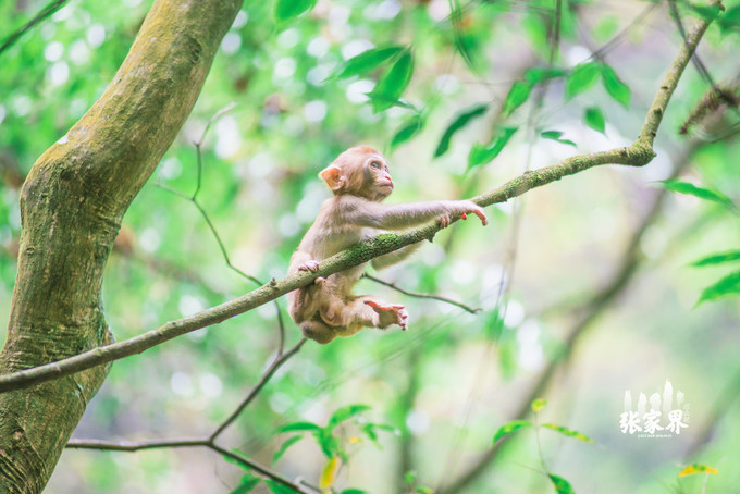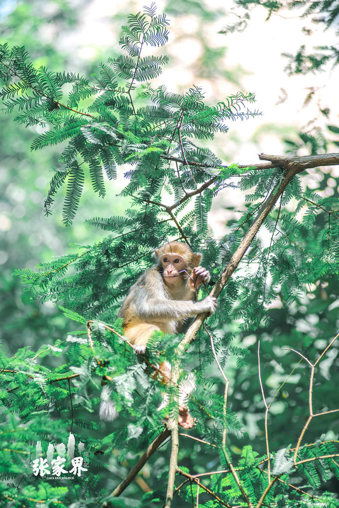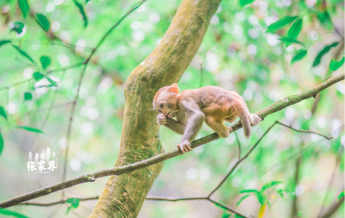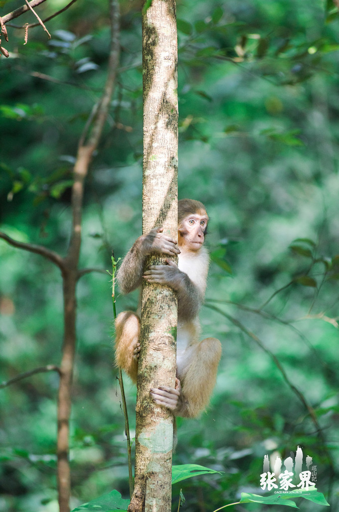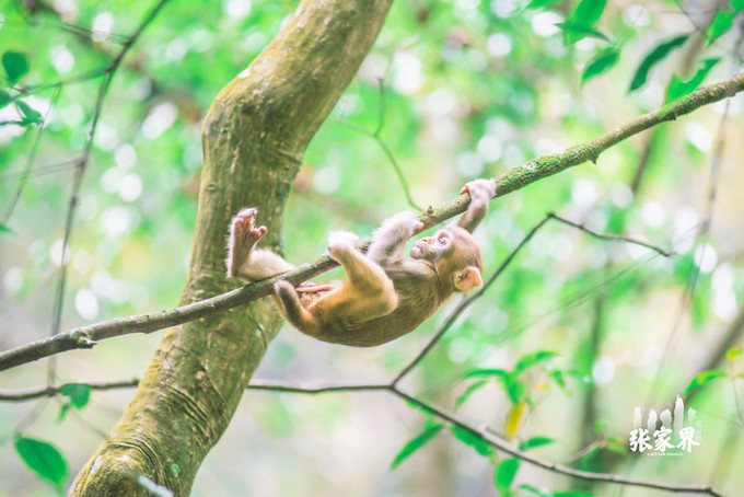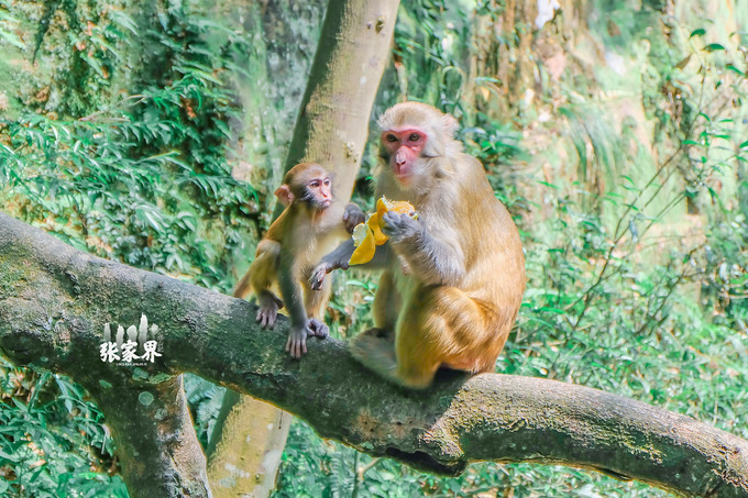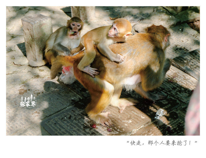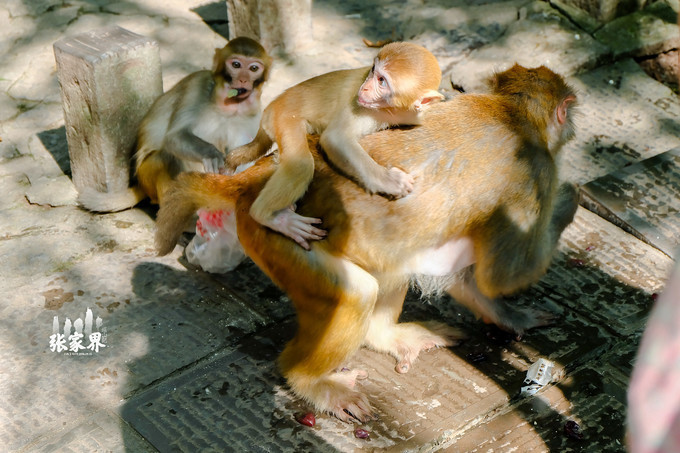 张家界国家森林公园张家界国家森林公园这一家三口 太和 谐了,小猴子骑在母猴身上真的是特别萌。